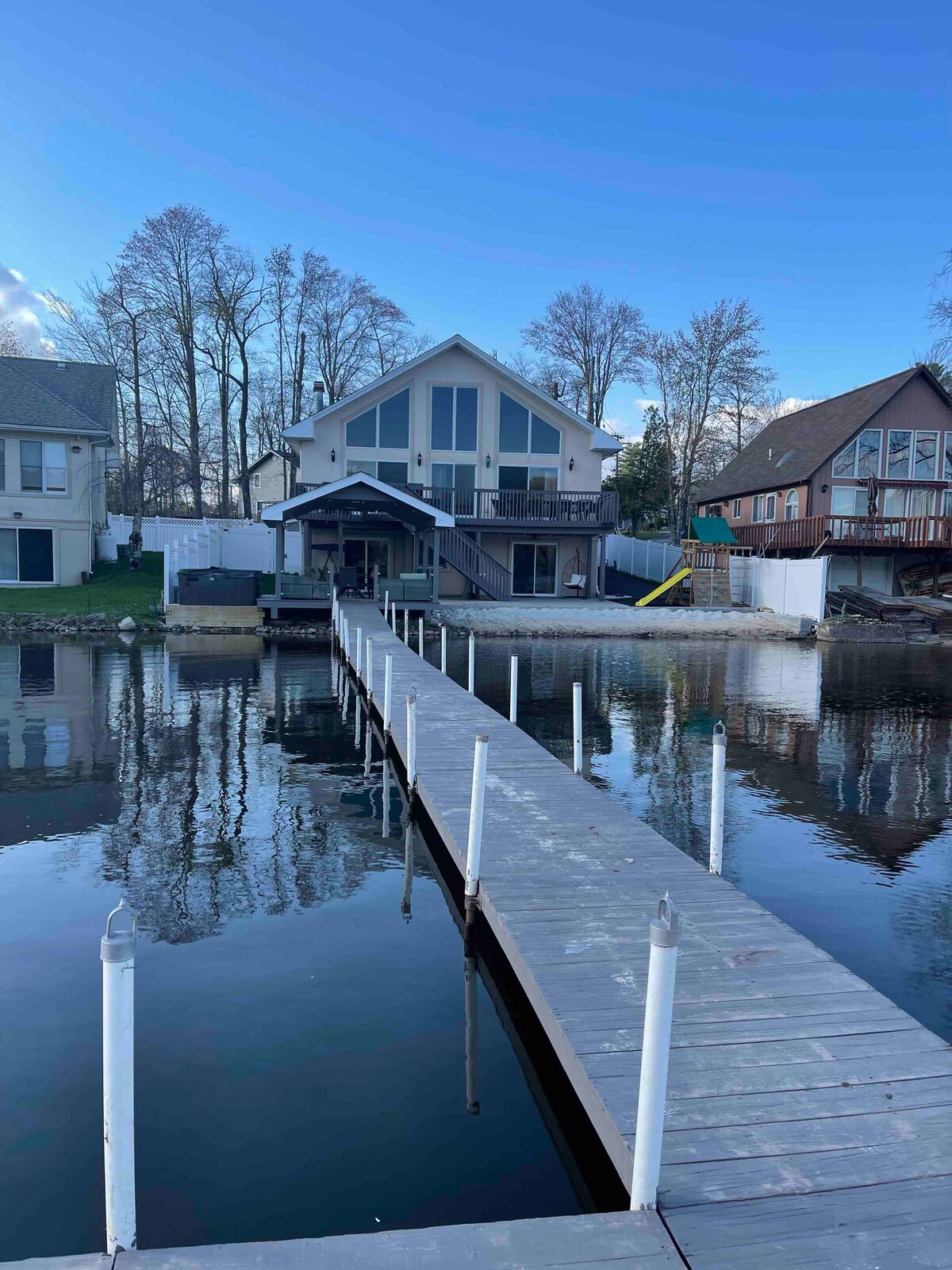 Luksusowy dom nad jeziorem z prywatnym dokiem, krytym podgrzewanym basenem, sauną, wanną z hydromasażem, pokojem gier i wieloma innymi udogodnieniami. Idealny dla dużych grup, może pomieścić 14 osób i ma 3 łóżka typu king-size, 1 duże łóżko podwójne, 2 podwójne i 4 bliźniaki. ✓Lakefront home w/ Private dock ✓Kryty podgrzewany basen i sauna ✓Kominek opalany drewnem (salon) ✓Zadaszona wanna z hydromasażem Pokój ✓gier ✓Podjazd dla 6 samochodów ✓Plac zabaw ✓Grill ✓Bezpłatna kawa ✓Pralka/suszarka ✓Prywatny dok (tylko lato)