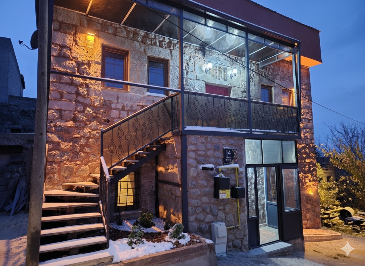 Our entire 2-floor stone & wood house near Erciyes Ski Center accommodates up to 8 guests with 7 beds + a sofa bed. The lower floor offers a fireplace, smart TV, large kitchen and a private Turkish bath (hamam). The upper floor has 2 bedrooms, each with private bathroom, smart TV and mini fridge. A warm and cozy place to relax after skiing. Free parking available. Perfect for families and groups seeking a ski holiday home.