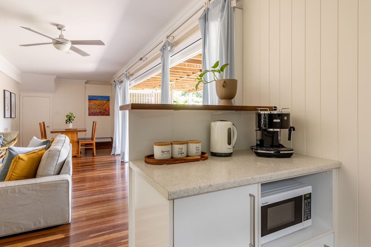 Witaj w niezwykłym ogrodowym raju! Wspaniałe, samodzielne prywatne studio położone nad spokojnym stawem. Zaprojektowany przez architekta, przestronny, w pełni wolnostojący z oddzielnym wejściem, skośnymi sufitami i naturalnym światłem. Spokojna oaza, wyposażona we wszystko, czego potrzebujesz do komfortowego i relaksującego pobytu. 7 km od CBD, spacer do autobusu, pociągu, sklepów, kawiarni. 15 min. jazdy do szpitali, QUT Wygodne łóżka, klimatyzacja, WiFi, nowoczesna łazienka, aneks kuchenny, pralka. Ciesz się spokojem! NIEODPOWIEDNIE DLA DZIECI PONIŻEJ 13 ROKU ŻYCIA.
