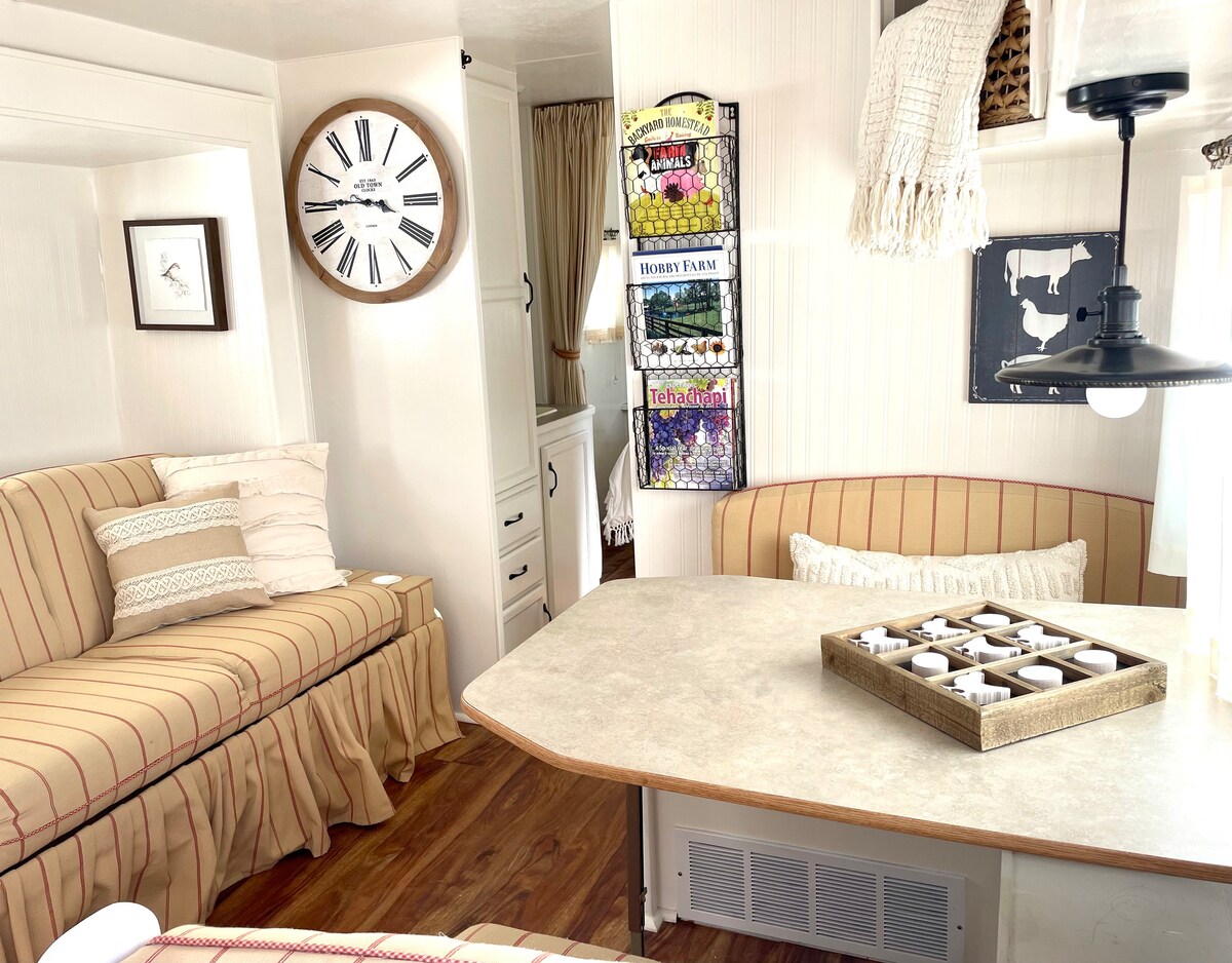 Get away from it all on our 7 -1/2 acre hobby farm in Tehachapi, California. Enjoy clean mountain air, happy farm animals, gorgeous starry nights and peaceful evenings relaxing by your own chiminea. Our darling travel trailer is newly remodeled and ready for your visit. It sits nestled in a quiet spot with its own deck. Tehachapi offers wineries, brew pubs, hiking and biking trails, native American history, train spotting, antique shopping, and much more. Plan your visit soon.