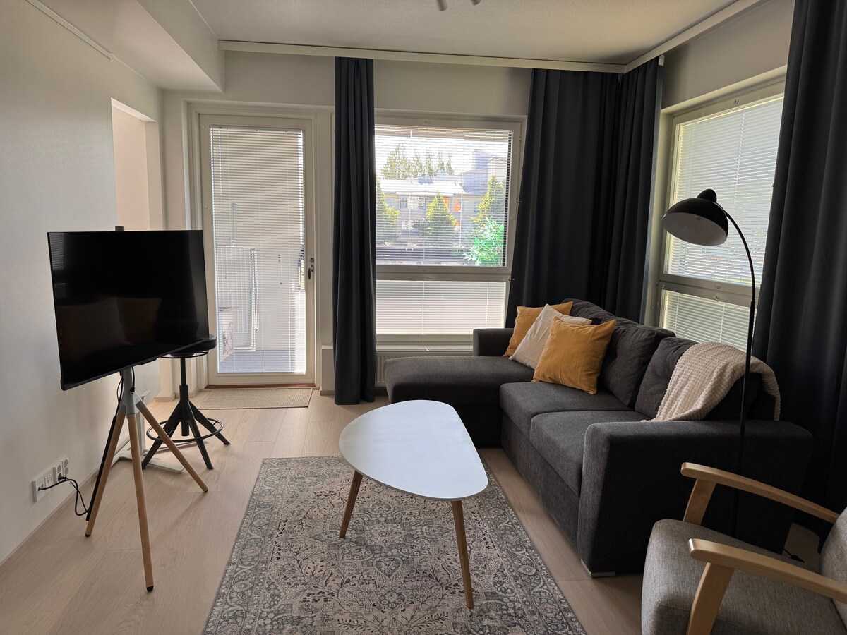 Modern 47.5sqm one-bedroom apartment just 10min walk to downtown. Easy access to public transportation and all the amenities the city offers. The apartment includes fully equipped kitchen, 49" UHD Smart TV, fast Wi-Fi and own Sauna! In the bedroom there is queen size bed and in the living room 80cm extra mattress. Apartment is good for groups of 3 people! Parking in warm garage. Possibility to charge EV for 20c/kwh.