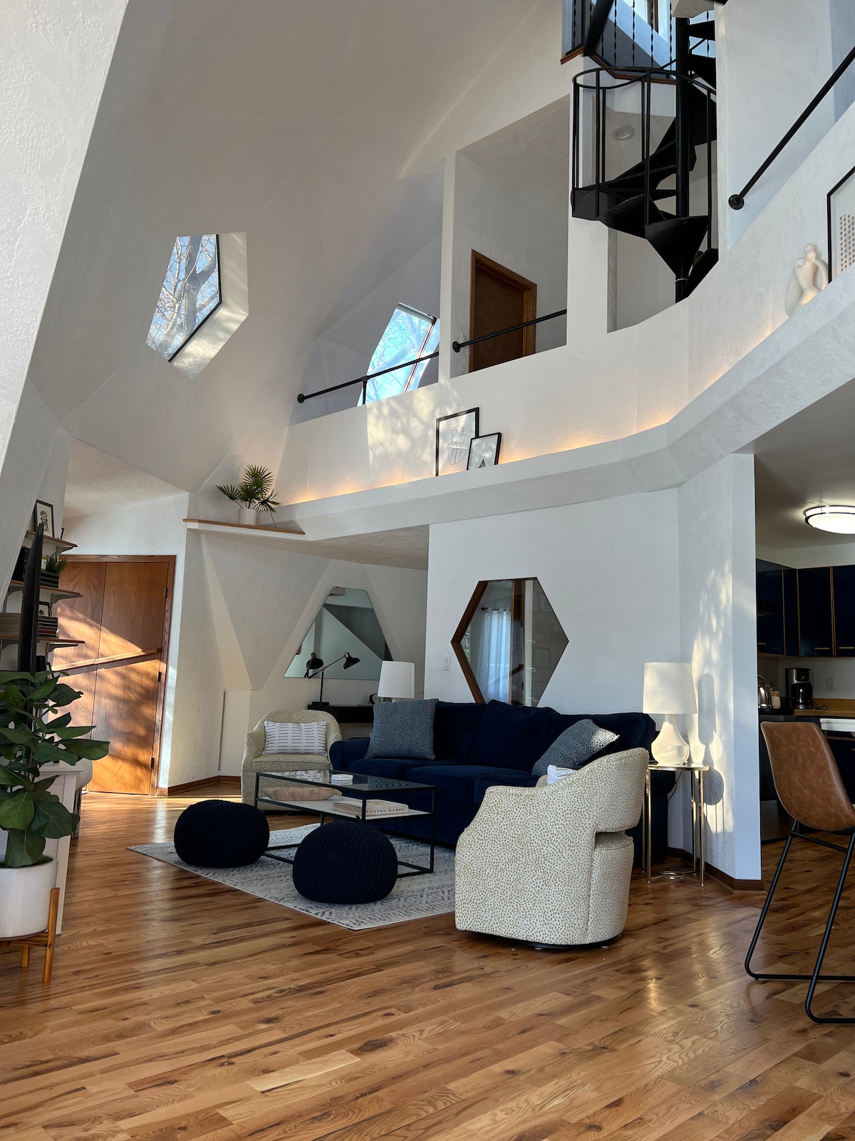 Escape to our spacious and luxurious designer open-space loft with panoramic downtown views through our giant windows. Whip up your favorite meals in our modern kitchen with modern stainless-steel appliances and plenty of storage space. A cozy and comfortable bed, smokeless fireplace, and ample walk-in closet ensure a clutter-free and restful environment. Treat yourself to a rain shower in any of the two bathrooms, complete with luxurious features like towel and mirror warmers.