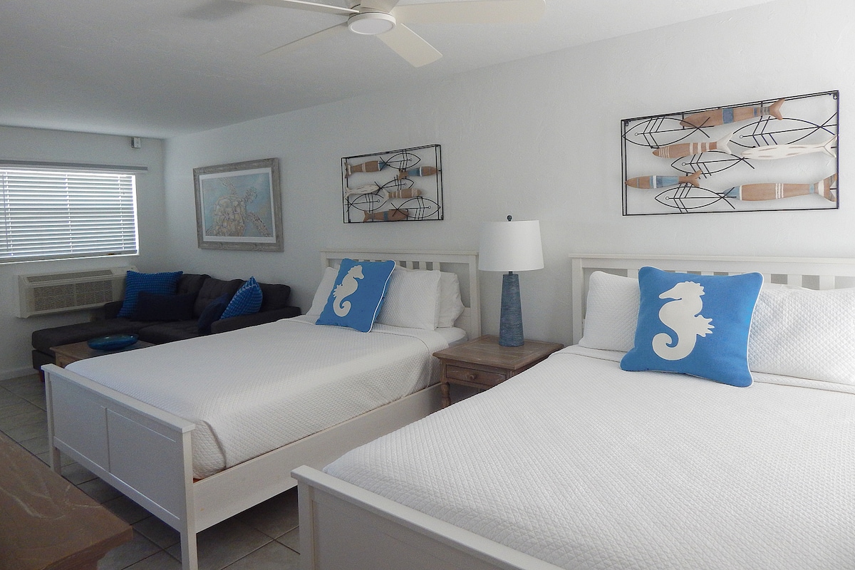Lovely coastal Keys studio condo in Key Colony Beach oceanfront complex with heated pool and private beach. Mieszkanie nr17 ma nowe łóżka z nakładkami na materace z pianki memory i odnowioną kuchnię z granitowymi blatami zaopatrzonymi we wszystko, co potrzebne do przyrządzenia pełnego posiłku (naczynia, naczynia, urządzenia i oczywiście blender itp.). Zrelaksuj się na tylnym balkonie i ciesz się zachodem słońca z Sunset Park tuż obok. Prywatna plaża z leżakami, stołami tarasowymi, tiki 's i grillem do użytku gości.