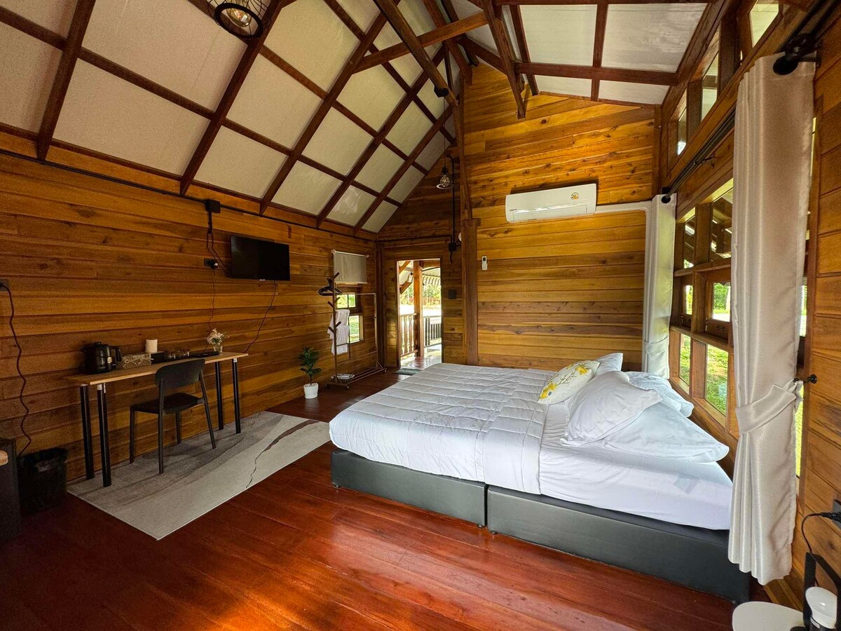 Moje zakwaterowanie jest zarządzane przez moją rodzinę. Zaledwie 7 minut od przystani do Parku Narodowego Cheow Lan. Jeśli się tu zatrzymasz, mój ojciec odbierze Cię z pobliskiego punktu odbioru pasażerów, także wtedy, gdy zechcesz popłynąć łodzią do Parku Narodowego Cheow Lan. To zakwaterowanie to sad owocowy. Pomelo i durian będą przynosić owoce w ciągu najbliższych 2–3 lat. Jeśli chcesz się zrelaksować i być blisko natury, to jest to miejsce z widokiem na góry i strumień. W pobliżu są restauracje.