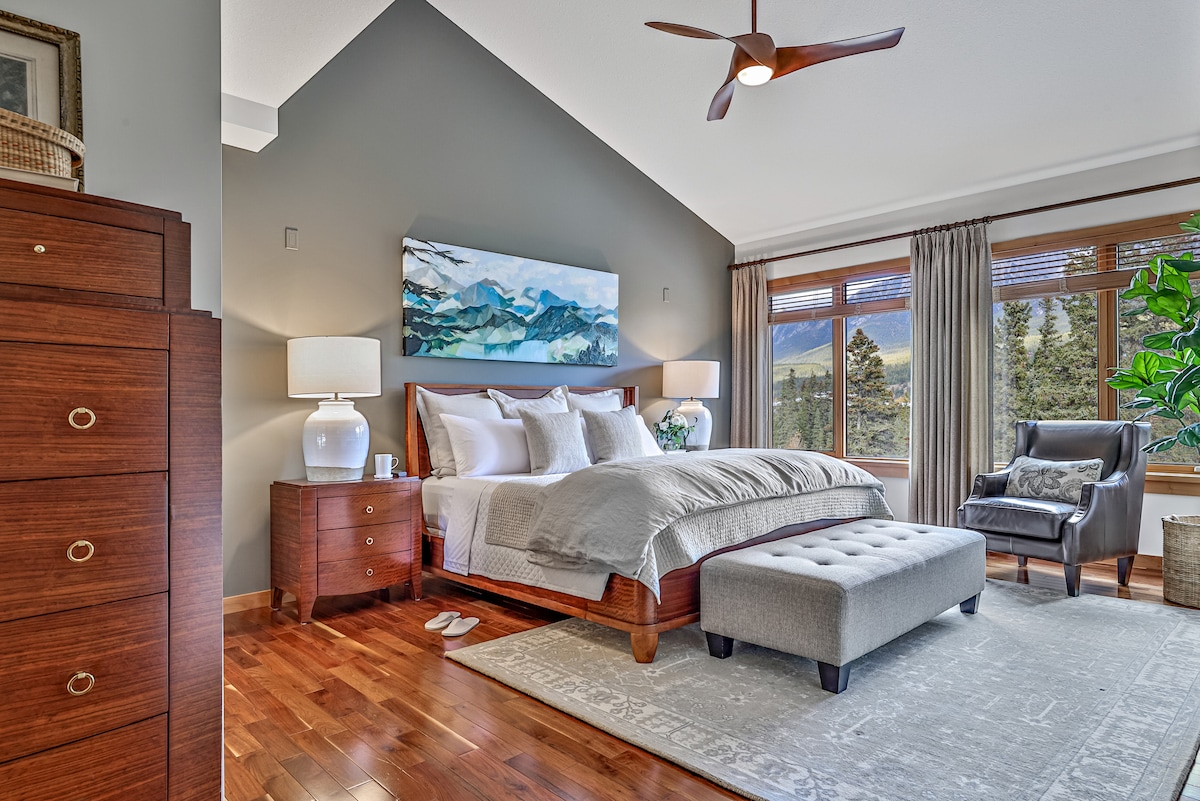 Narciarstwo w / z prywatnej wanny z hydromasażem Narożny apartament z 2 sypialniami z sypialnią główną z łóżkiem typu King. Ogrzewane podłogi w łazience. Zapierające dech w piersiach widoki z każdego pokoju, w tym otwarty narożny balkon z wanną z hydromasażem i grillem z widokiem na Gondolę, Van Horne i Blackwater Mountain Ranges w zaciszu Twojego domu z dala od domu w Kicking Horse. 5 parków narodowych w pobliżu! Restauracje i gondola na szczyt Kicking Horse w odległości 1-5 minut jazdy na nartach/spaceru.