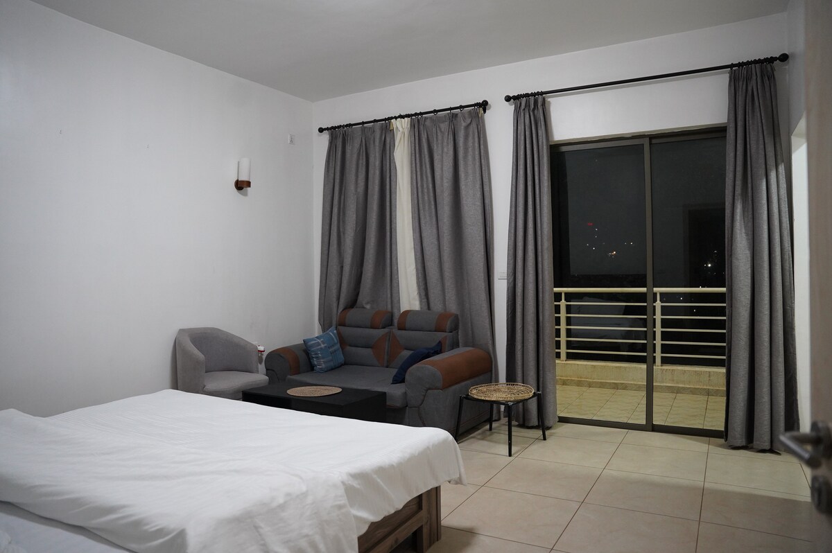 Wybierz się do tego stylowego i przestronnego apartamentu typu studio, idealnie zaprojektowanego dla osoby podróżującej w pojedynkę lub pary. Wyjdź na prywatny balkon, aby cieszyć się zapierającymi dech w piersiach panoramicznymi widokami na tętniącą życiem panoramę Kigali i bujne zielone wzgórza. 5 minut spacerem do KCC, Simba Supermarket Gishushu