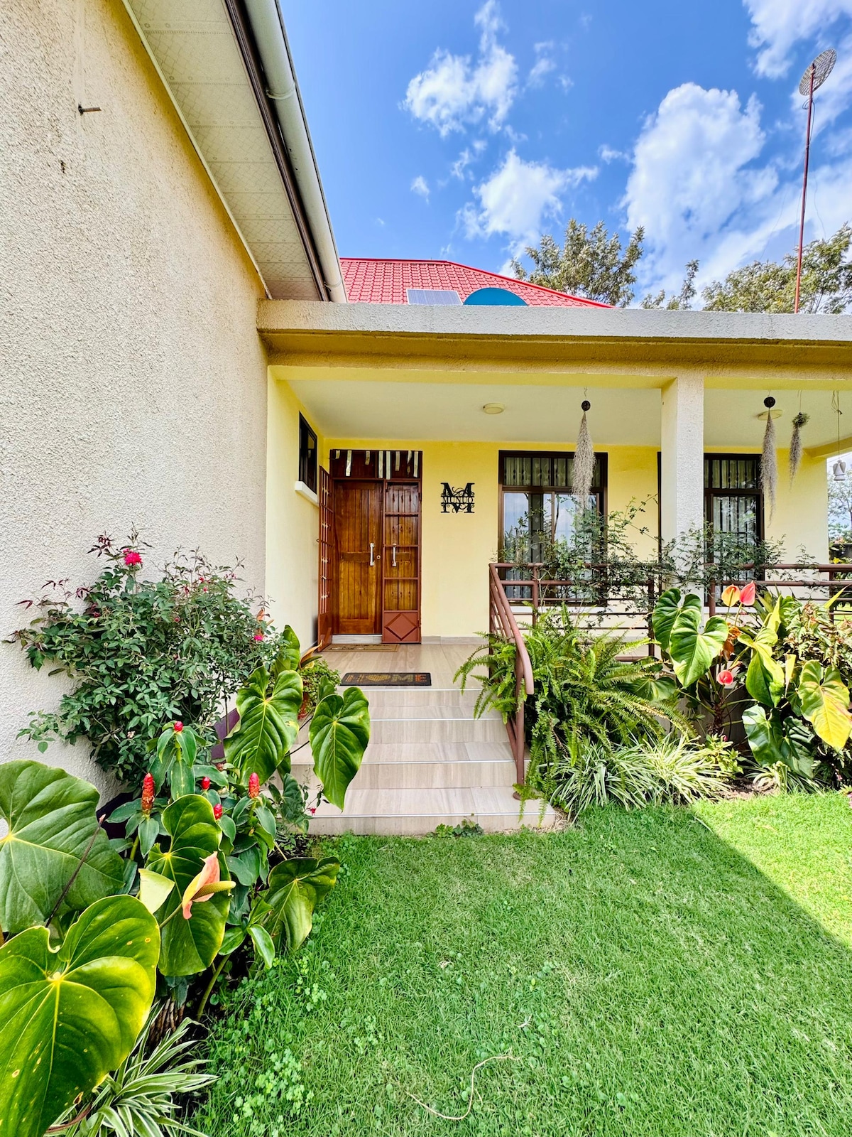 A peace full home in a quiet neighborhood. Secure fenced compound with security guard, free parking in the compound. Covered porch to enjoy the gardens and nice climate. Ground floor: two self contained bedrooms, living room, kitchen with cooking facilities and fridge, store and public bathroom. On first floor two additional rooms and big open space. Easy access to public transport. Nice view on mount Kilimanjaro.