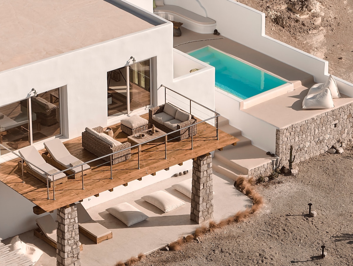 Na sielankowej greckiej wyspie Milos, w spokojnej okolicy Pachena, stoi wspaniała willa w stylu cykladyckim, która uosabia esencję śródziemnomorskiego luksusu. Ten wykwintny obiekt z widokiem na lśniące Morze Egejskie to arcydzieło wzornictwa, które oferuje spokojne schronienie dla osób szukających niezapomnianego wypoczynku.