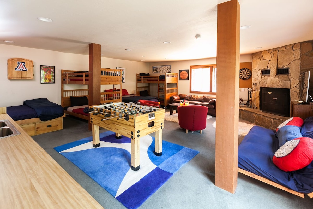 Real Tahoe knotty pine home holds 3 families with 2 living rooms and 2 king suites, queen bedroom, 4 bunk room=10 in beds+2 more on queen sofa bed +6 air mattresses. Downstairs pool table room & a bigTV. Spa on deck outside game room. Luxurious white cotton linens+DOWN on all beds 2 BigTVs& 3TV in bedrooms toys, kids dishes, pacnplay Children play on carpet near kitchen with our toys while you cook. Take our 2 small & huge 3 person kayak to Donner Lake. Movie night in our living room.