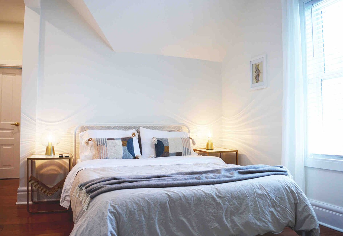 Apartament ten ma być wykorzystany jako alternatywa dla małego pokoju hotelowego położonego na drugim piętrze tego zabytkowego domu. Jest tu prywatne wejście, po wejściu po schodach do apartamentu, który obejmuje część sypialną, jadalnię, aneks kuchenny ze zlewem, lodówkę barową, kuchenkę mikrofalową, czajnik i ekspres do kawy, pełną łazienkę i pralkę/suszarkę. W tym apartamencie nie ma piekarnika ani kuchenki – nie jest duży, ale ma wszystko, czego potrzebujesz w przytulnej przestrzeni. Poza prywatną przestrzenią znajdują się dwie wspólne strefy wypoczynkowe. Twój apartament znajduje się zaledwie dwie przecznice od jeziora i parku nad jeziorem oraz zaledwie 10 minut spacerem od restauracji, barów i przystani Kingsville Jiiman. Baw się dobrze!