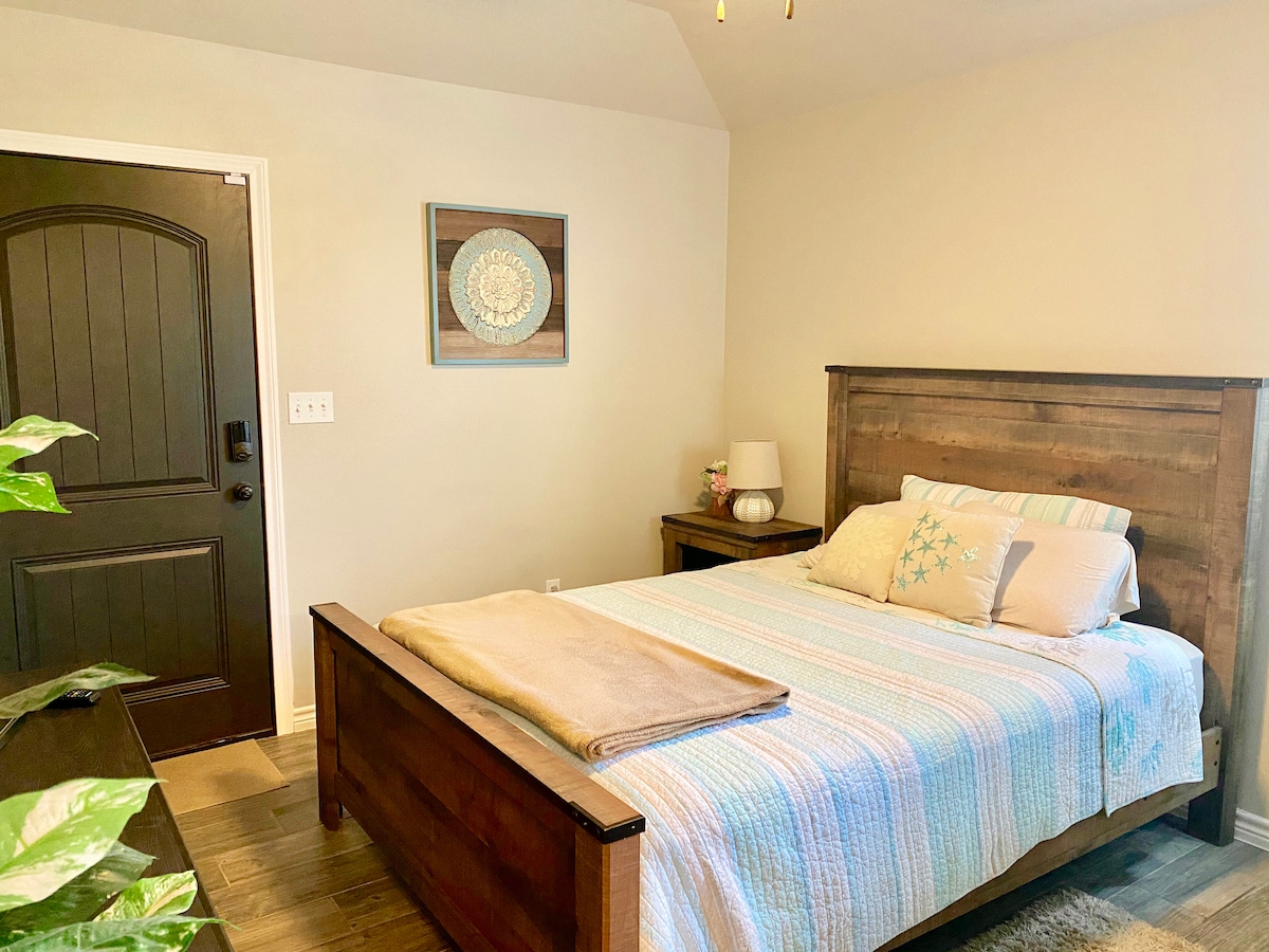 Prywatny pensjonat z pełną łazienką w pięknej, cichej okolicy ze sztucznymi jeziorami, małymi parkami i placem zabaw. Posiada własną klimatyzację/ogrzewanie, Wi-Fi, mini lodówkę, ekspres do kawy Keurig, żelazko, 55-calowy telewizor Smart TV, system zmiękczania i filtracji wody oraz oddzielny generator prądu. 5 minut jazdy do sklepów/restauracji i 20 minut jazdy do centrum miasta lub na plaże S.Padre Island.