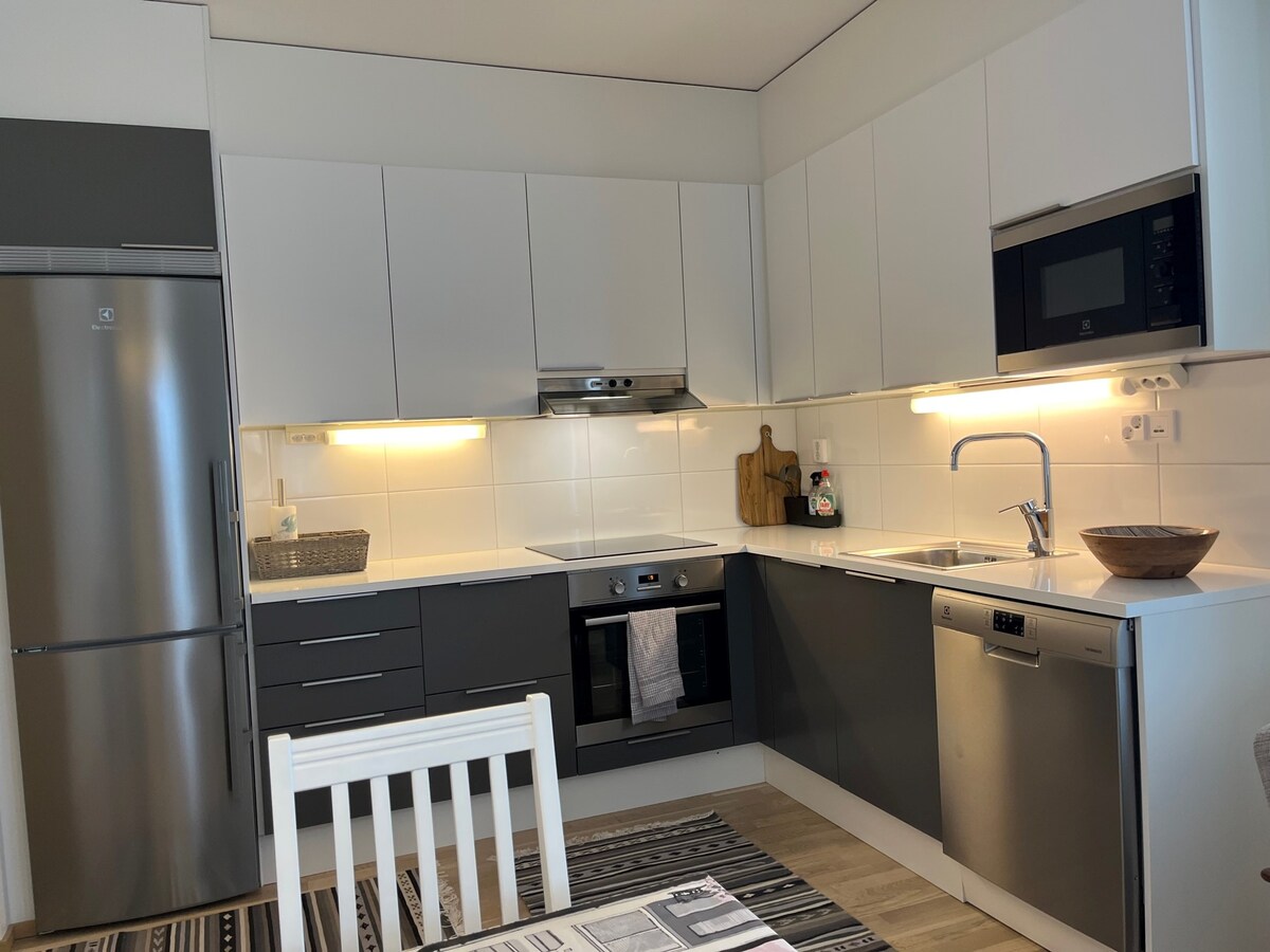 Jasny, nowy, dwupokojowy apartament w dobrym stylu, tuż obok centrum handlowego Puuvilla. Lokalizacja apartamentu jest bardzo centralna, ale nadal bez hałasu ulicznego. Śródmieście około 1 km, do Kirjurinluoto 900 m. Apartament ma wszystkie potrzebne urządzenia, a także pralkę, która suszy. Łóżko podwójne i podwójna sofa. W razie potrzeby dostępne jest również dodatkowe łóżko dla jednej osoby. Apartament z 55-calowym telewizorem, radiem i Wi-Fi/światłowodem. Przytulne patio z meblami ogrodowymi i miejscem parkingowym na podwórku.
