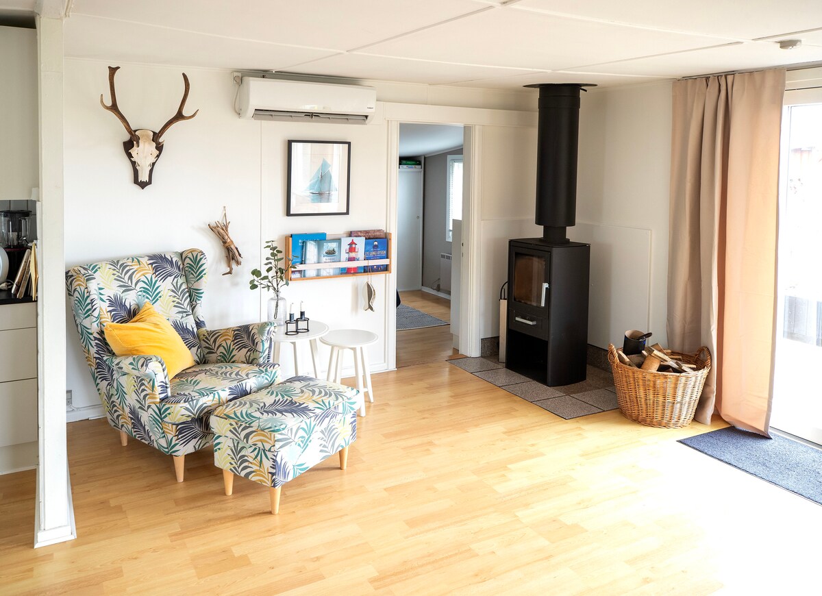 Zrelaksuj się w tym wyjątkowym i spokojnym domu z widokiem na fiord Vejle, pole i las. W domu znajduje się salon z kuchnią, jadalnią i sofą, toaleta z prysznicem i piętro z sypialnią. Dostępne są dwa łóżka piętrowe (podwójne) oraz jedno łóżko stojące. Pamiętaj, że schody na pierwsze piętro są nieco strome, a wokół podwójnego łóżka nie ma zbyt wiele miejsca. Na zewnątrz znajdują się dwa tarasy, oba z widokiem. Na miejscu znajduje się piec opalany drewnem z wolnym drewnem na opał. Pościel i ręczniki są wliczone w cenę.