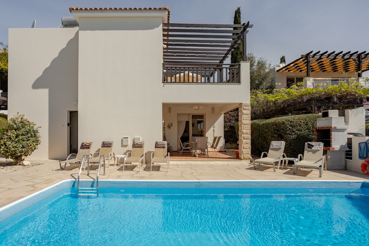 Elegant Villa with Private Pool in Coral Bay, Paphos Nestled in the heart of Paphos, just minutes from Coral Bay’s sandy beach, restaurants, and cafés, this stylish villa blends modern comfort with traditional charm. Enjoy a private pool, sun deck, and alfresco dining with a Cypriot BBQ. Inside, relax in elegant interiors with fast Wi-Fi, Sonos music, Apple TV, and full air conditioning. With three bedrooms, a fully equipped kitchen, and stunning sea views, this is the perfect getaway.