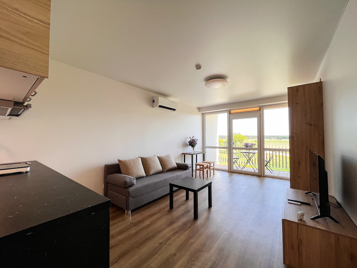 One room flat in Šventoji. In twenty-seven square meters, you will find a kitchen with all the needed equipment, a sofa to watch favorite movies, and a bed which can be used for a sweet night's sleep and be folded during days to get extra space. For comfortable living there is a dishwasher, washing machine, and oven. Also, in the common areas you can use a pool, a gym, and a co-working zone.