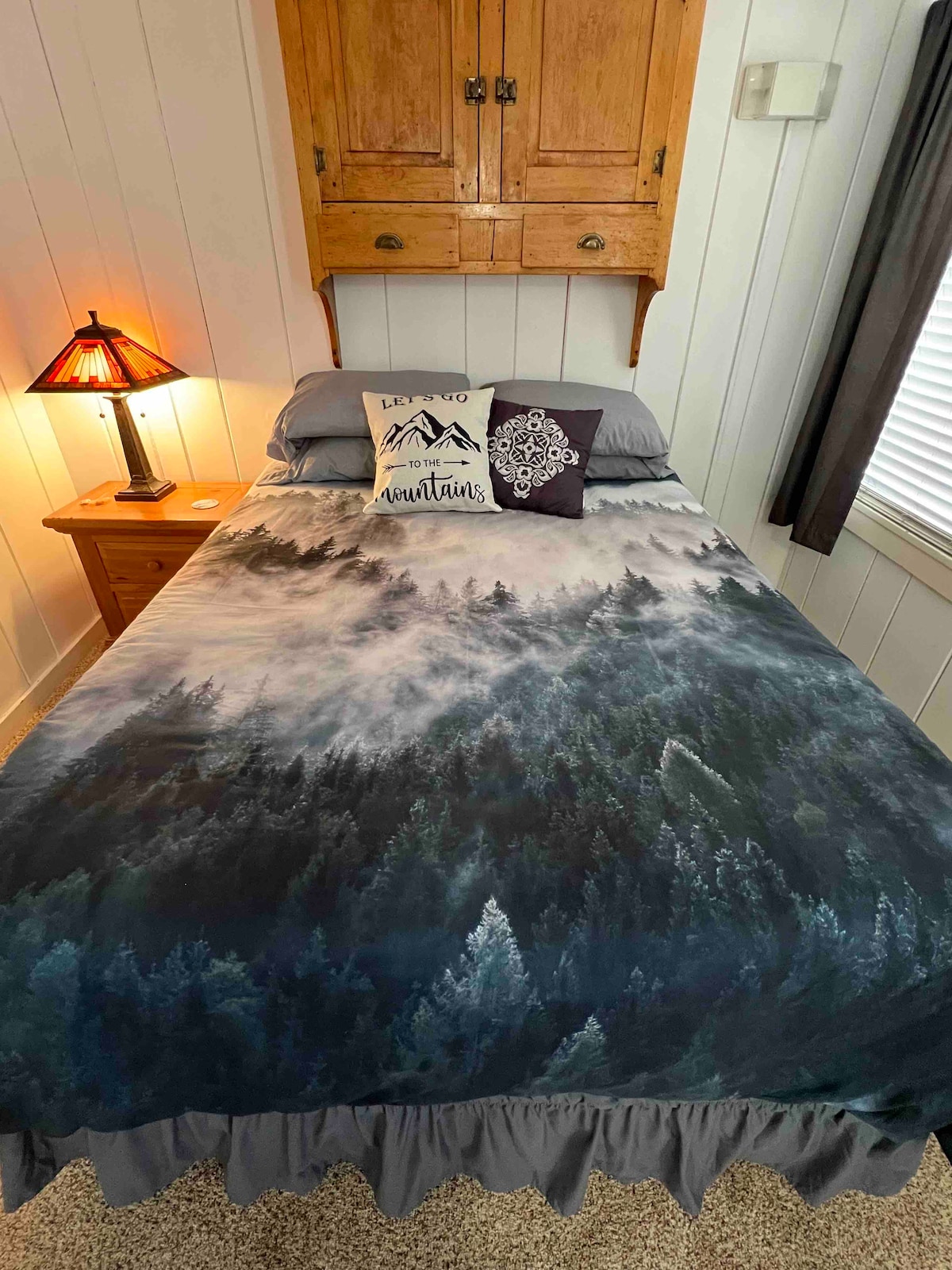 Enjoy a Chalet! Our larger room with an impressive view of the mountains. We have decorated these rooms to show off some of our favorite locations that our valley has to offer. This style of room will accommodate 2 guests. These rooms are comfortably appointed with soft linens and plush pillows. Flat screen smart TV's are easy and convenient for our guests to use. After an amazing day exploring everything that Fall River Valley has to offer, relax in your room or enjoy an evening on the porch.
