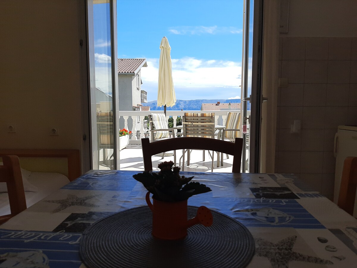 This studio apartment for two is situated above Mošćenicka Draga. The best thing about studio is magnificent view on the Kvarner gulf which you will never forget. You have 4 km of road from the Adriatic sea and from the one of the most beautiful beaches in Croatia...Sipar in Mošćenička Draga and 1,2km from Mošćenice. There is a way through the wood by foot and you are on the beach in 15 min . Car recomended. Except the view you can enjoy peaceful area without many poeple and see real Croatia.