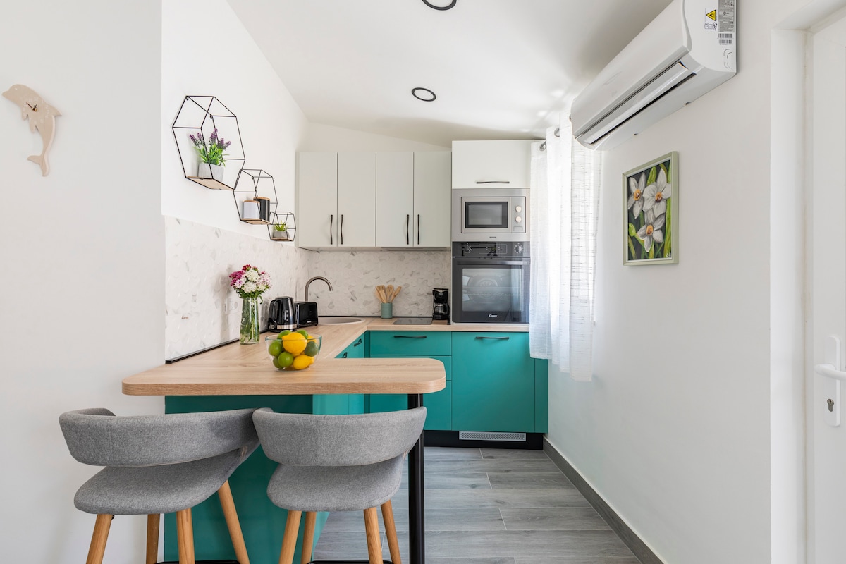 Enjoy your vacation with us and relax in our newly decorated studio for two, just five minute walk from town center. This studio apartment features sleeping area, bathroom with walk in shower and washing machine, fully equipped kitchen with dining area and patio.