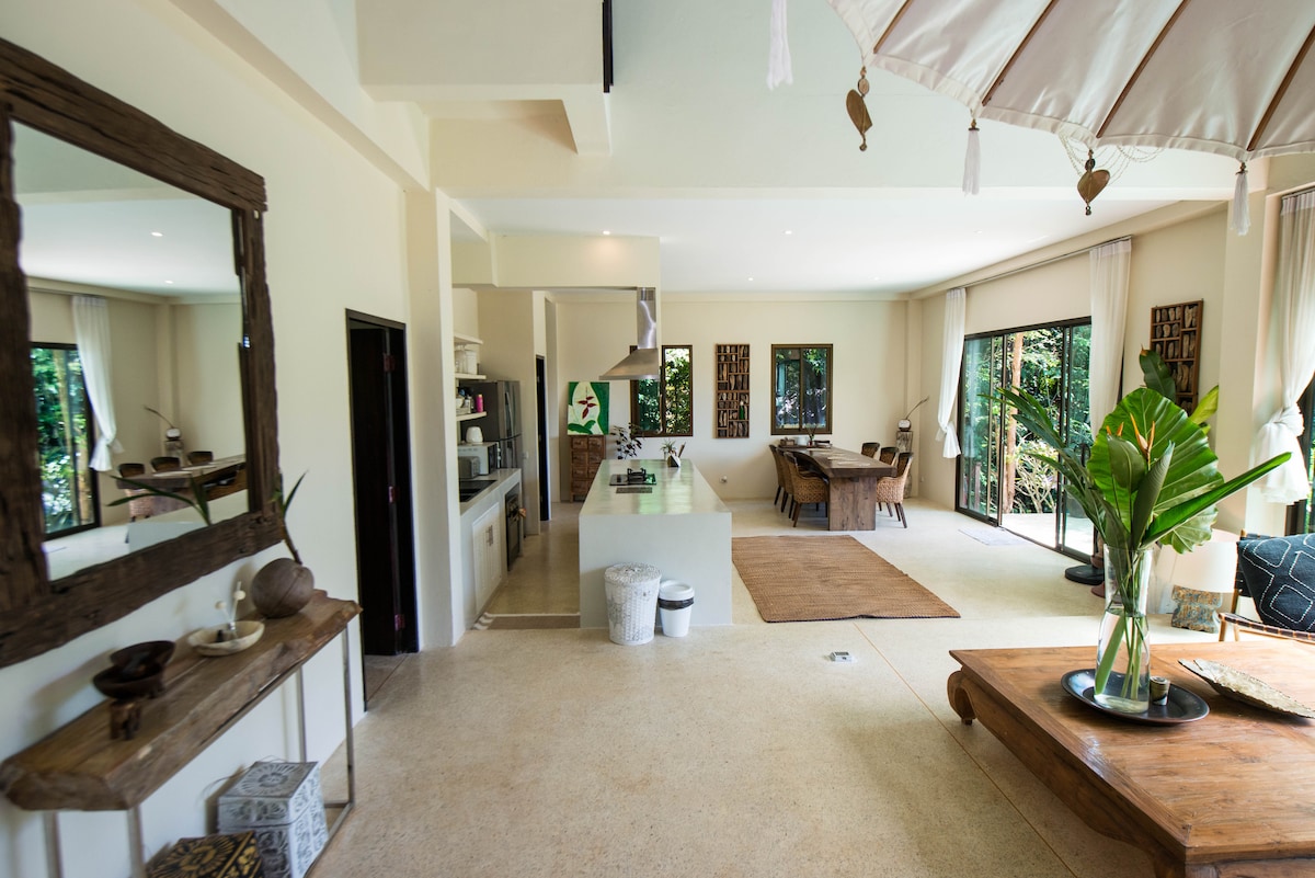 Nestled in the rainforest on the mountainside. Teak Hill Pool Villa and Garden in Bangbao brings you absolute privacy. Big brand new villa in a quite and beautiful green area of west-south Koh Chang. 100m from main road. 2 minutes walk from fisherman village, 7/11, pier, restaurants, shops, laundry service. 5 minutes walk to the beautiful Klong Koi beach. 5 munites drive from Lonely Beach with bars and night life.