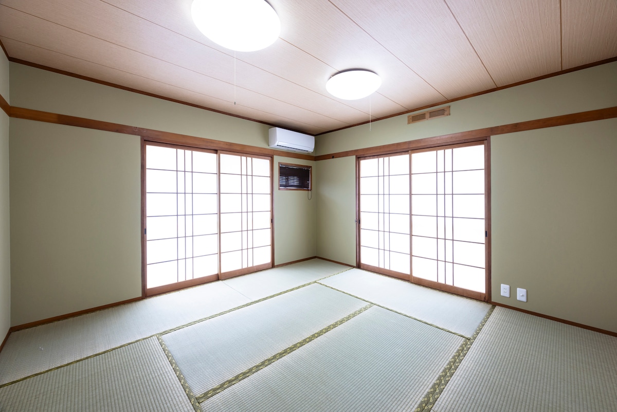 To relaksujący dwupiętrowy dom położony w spokojnej dzielnicy mieszkaniowej.Może pomieścić do 8 osób, co czyni go idealnym miejscem dla rodzin, a także na rodzinne wycieczki i długoterminowe pobyty z grupami. Łącznie 3 sypialnie.Są 2 pokoje w stylu zachodnim z łóżkami, a drugi pokój jest w stylu japońskim, gdzie można spać na futonie.Jest to konfiguracja pokoju, w której można cieszyć się zarówno japońską, jak i zachodnią atmosferą. Na parterze znajduje się przestronna przestrzeń dzienna z sofą, telewizorem i niskim stolikiem.To idealne miejsce, w którym każdy może spędzać czas, rozmawiać lub oglądać filmy. Kuchnia jest w pełni wyposażona w naczynia, kuchenkę mikrofalową, lodówkę itp., a samoobsługa jest bezproblemowa.W pobliżu znajduje się również supermarket i sklep spożywczy, co ułatwia zakupy składników.Możesz zrelaksować się, jakbyś był we własnym domu podczas śniadania lub kolacji.