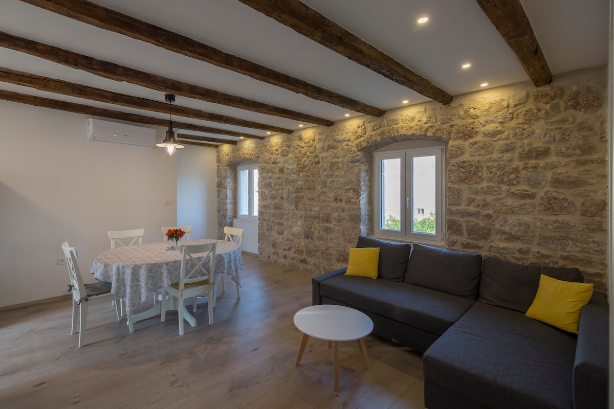 Apartament znajduje się na drugim piętrze starego kamiennego domu tuż nad morzem. Znajduje się 5 minut spacerem od promenady i tuż nad plażą. Posiada w pełni wyposażoną kuchnię, jedną sypialnię, salon, łazienkę i prywatny balkon z widokiem na morze i wyspę Biševo. Jest wyposażony w telewizor LCD, klimatyzację, Wi-Fi, wentylator sufitowy w sypialni (w zimie grzejnik w razie potrzeby). Wynajem apartamentu wiąże się z możliwością korzystania z kajaka dwuosobowego w trakcie pobytu.