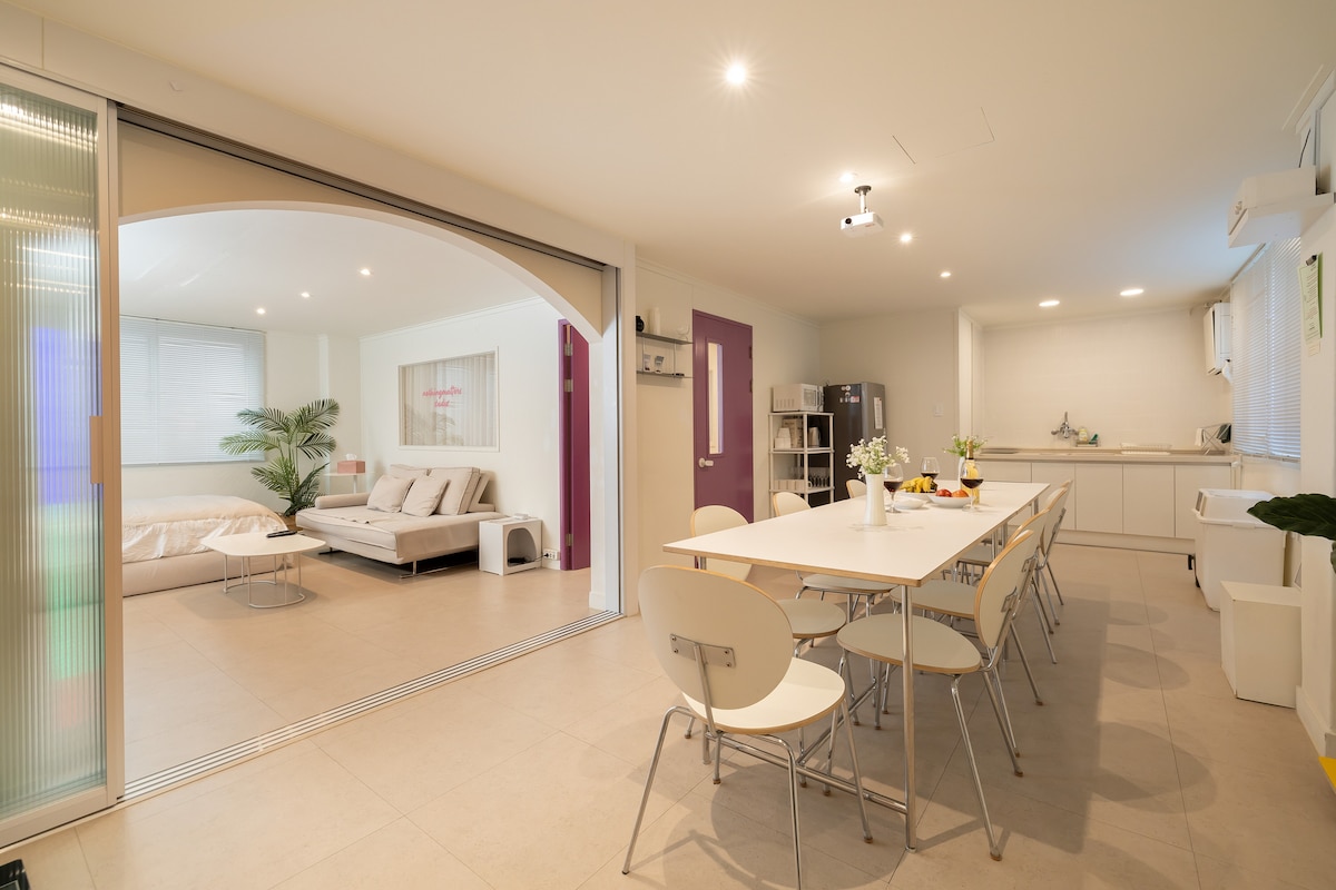 📍건대에서 드물게 30평의 넓고 쾌적한 공간으로 디자이너가 직접 제작한 다양한 감성 가구와 소품으로 이루어진 감각적이고 세련된 공간으로 각종 모임을 즐기기에 넓고 쾌적한 장소여서 재방문이 높은 공간입니다! - 인천공항 약 100분(6013번 버스-정류장에서 3분) - 성수역 3분 - 홍대입구 29분 - 명동(을지로입구역) 18분 - DDP역 13분 🏠브라이덜 샤워 등 다양한 모임이 가능한 감성 공간으로 조용한 환경이라 가족여행에도 좋습니다. 간단한 보드게임이 준비되어 있어요. 🍽️ 다이닝룸에는 대형 10인 테이블, 의자가 있는 주방이 있으며 실내 화장실, 소파 베드, 갖추고 있으며 빔 프로젝터 및 55인치 스마트TV설치가 되어있습니다. 21kg 대형세탁기, 건조기, 중형 냉장고가 있어서 출장이나 한달살기에도 적합한 장소입니다.