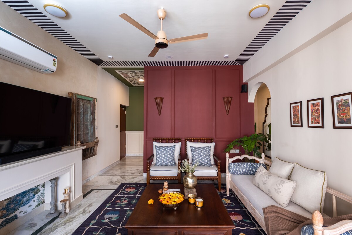 Witamy w The Shri Lalluji Suite – surrealistycznym, ręcznie malowanym mieszkaniu z jedną sypialnią, w którym nie tylko mieszkasz w domu, ale także w szkicu. Każda ściana, łuk i rama zostały zaprojektowane z wykorzystaniem tradycyjnych czarno-białych miniaturowych fresków z Radżastanu. Idealny dla par, miłośników designu i podróżujących bez pośpiechu – apartament łączy królewskie dziedzictwo Dżajpuru z nowoczesnym komfortem.