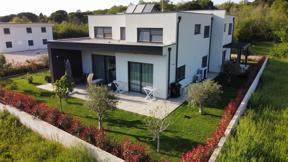 A newly built 30m² studio apartment perfect for two, less than a 15 min walk from the nearest beach. Enjoy a king-sized bed, a spacious bathroom, and a fully equipped kitchen. Relax in the private garden or take advantage of the private parking space. Modern amenities include air conditioning and tasteful décor. Large windows fill the space with natural light, creating a cozy and inviting atmosphere. Ideal for a comfortable and convenient stay, blending contemporary design with Istrian charm.