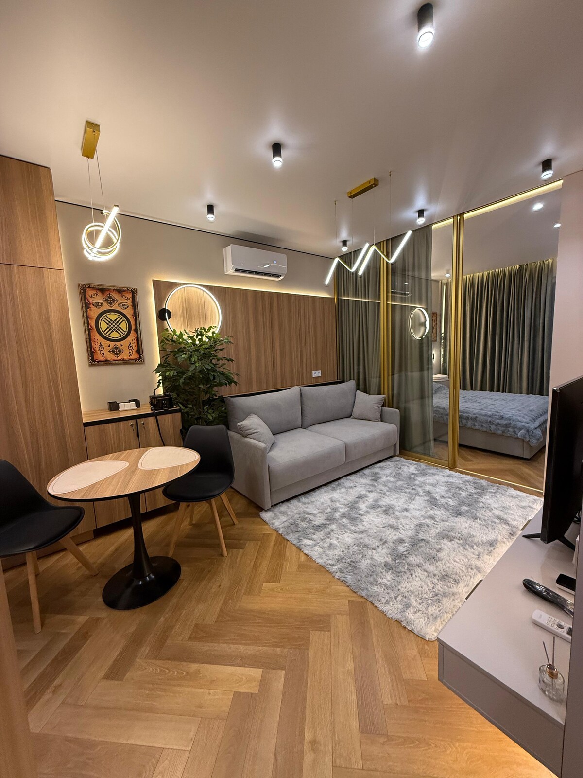 Apartament typu studio ze stylowymi wykończeniami w nowym kompleksie mieszkaniowym premium znajduje się w centralnej dzielnicy Ałmaty, 5 minut spacerem od centrum handlowo-rozrywkowego MEGA Park. Studio ma wszystko, czego potrzebujesz na komfortową romantyczną lub biznesową podróż – od wygodnego łóżka po możliwość przygotowania śniadania lub kolacji. Goście mają dostęp do telewizora z Netflixem i dostępem do internetu, Wi-Fi, pralki, suszarki do włosów, kuchni i pościeli. Ciesz się stylowym doświadczeniem w samym sercu miasta.
