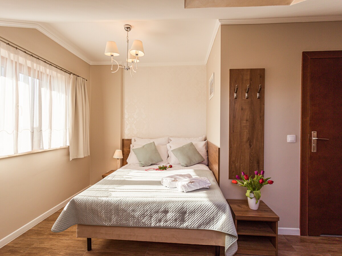 Słoneczne i zadbane mieszkanko z darmowym miejscem parkingowym w garażu podziemnym oraz z tarasem. W sypialni łóżko dla 2 osob, plus kanapa rozkładana w salonie, na ktorej może nocować ,np.dziecko jeśli podróżujesz z rodziną. Mieszkanie na parterze. Na wyposażeniu, tv , wifi , suszarka do włosów, żelazko, deska do prasowania, pralka, czajnik, plyta i piekarnik, mikrofalówka oraz lodówka.