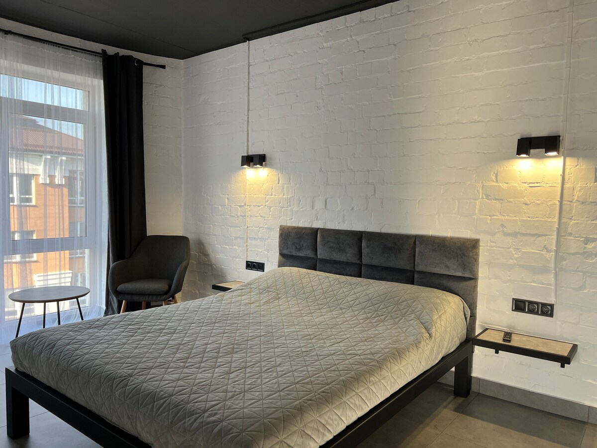 Nowoczesny apartament z jedną sypialnią i indywidualnym ogrzewaniem w nowym budynku, 15 minut do centrum Wygodny apartament w nowym budynku, położonym w wygodnej i cichej okolicy. To tylko 15 minut spacerem do centrum. - Przestronny pokój w nowoczesnym stylu - Kuchnia jest wyposażona we wszystko, czego potrzebujesz: lodówkę, kuchenkę, mikrofalówkę, czajnik, naczynia. - Pralka, Wi-Fi, telewizor, wanna. - Pobliski supermarket, kawiarnia, apteka, przystanek komunikacji miejskiej. Idealny wybór na podróż służbową lub wakacje.