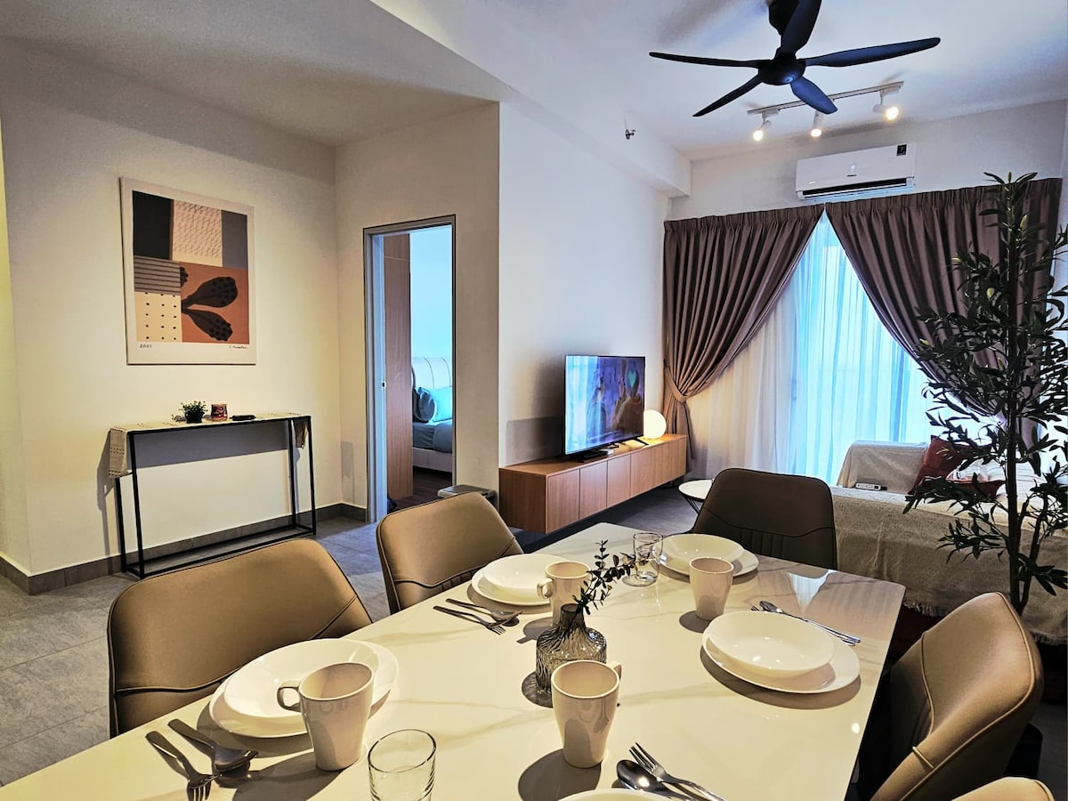 Sit back and relax in this calm, stylish space. Why Orchid 2BR suite at Lucentia Residence: - Best views of KL - Beautifully decorated with a fun spirit - Centrally located & attached to public transit hub - Fast wifi - 2 TVs with Netflix & others - 2 gorgeous pools - Family friendly with baby crib & highchair - Gym, pool table, BBQ pits, piano - Garage parking - Recommended to Sleeps 5, max 6 - LaLaPort Shopping Mall & the WOW entertainment street are attached - Grocery, drug store & Cinema etc