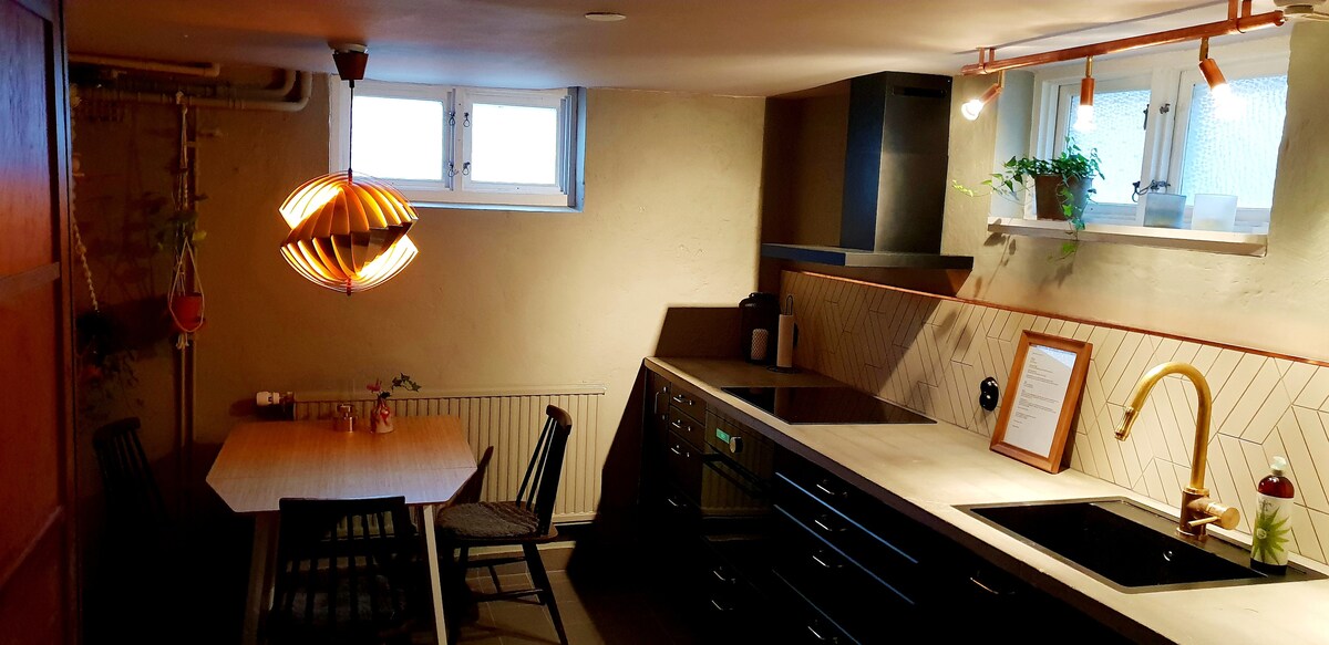 Wyjątkowy apartament w piwnicy o powierzchni 60 m2, który jest częścią większej willi. Przyjazne dla rodzin z mnóstwem atrakcji dla dzieci, zabawa w zamek, morze piłkarskie i mnóstwo zabawek. Prywatna toaleta z prysznicem, kuchnią, sypialnią i salonem. Nowoczesne skandynawskie rustykalne wnętrze z betonowymi podłogami i meblami. 10 min pieszo do małego portu z przyjemnym pływaniem. Przystanek autobusowy w pobliżu , tylko 20 minut do Göteborga Centrum (Linneplatsen)!