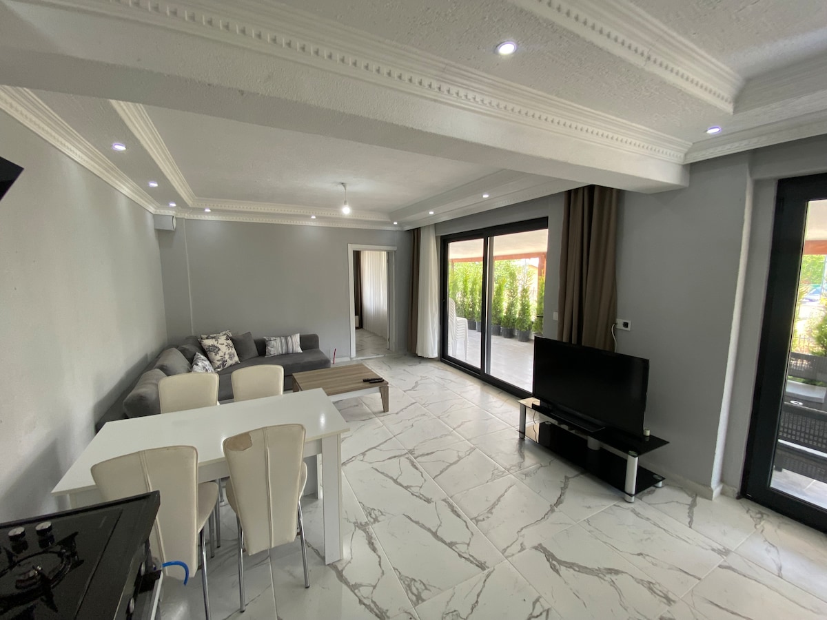 Apartament jest odpowiedni dla rodzin i par, znajduje się w centrum Mürefte, 25 metrów od morzem. Jest tu 1 sypialnia z łazienką dla dorosłych, druga sypialnia z podwójną rozkładaną sofą. Jest też druga łazienka z pralką. W kuchni znajduje się lodówka, zmywarka i wszystkie podstawowe przybory kuchenne. Balkon z czteroosobowym stołem łączy kuchnię z salonem. W salonie znajduje się sofa dla 2 osób, sofa dla 3 osób, okrągły stół i telewizor.