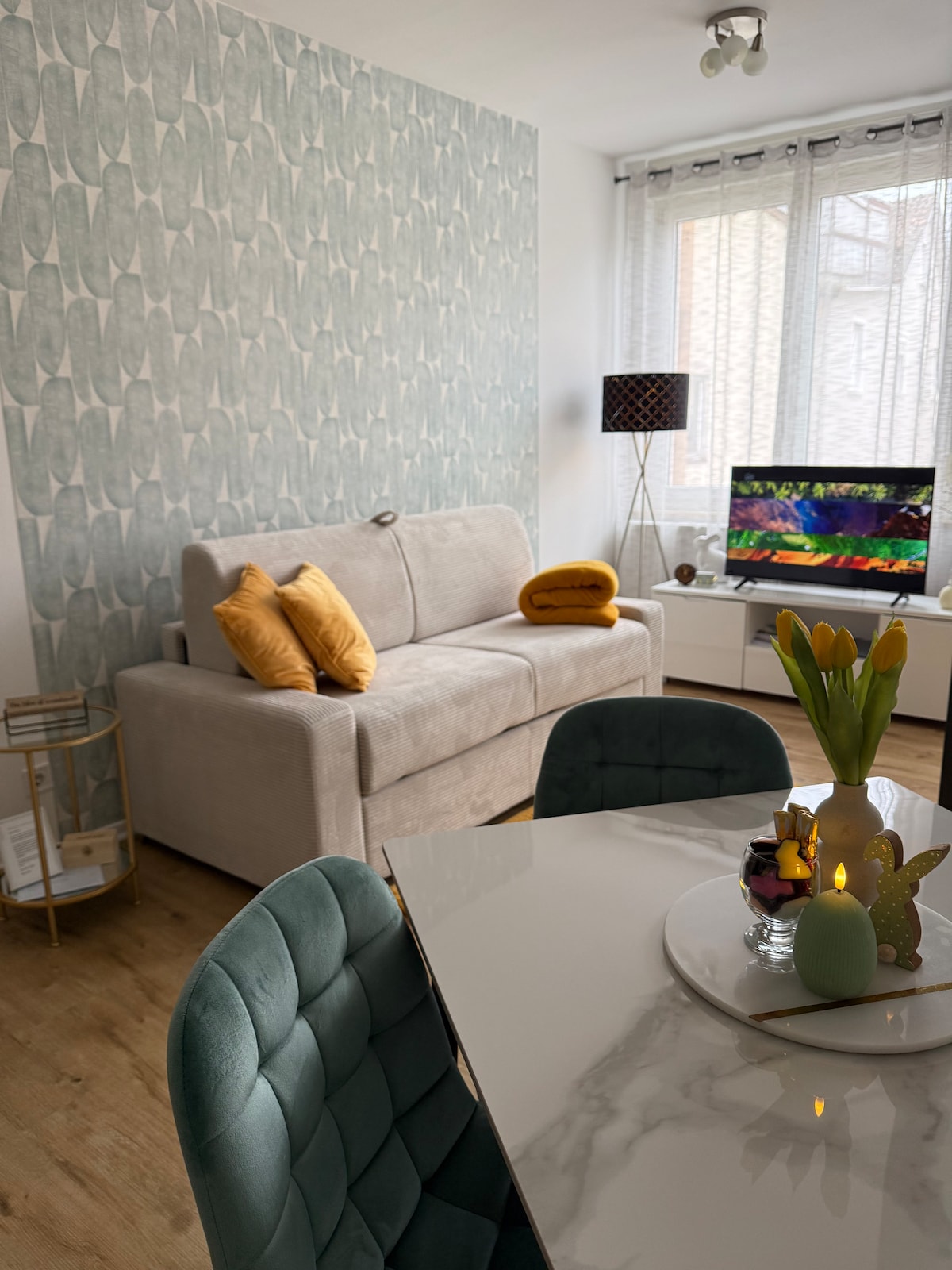 Ten komfortowy apartament o powierzchni 108 m² (bez barier) znajduje się na parterze i się w urokliwej, przypominającej wioskę okolicy na obrzeżach miasta, z łatwym dostępem do barokowego miasta Fulda i pobliskiego regionu Rhön. Oprócz dwóch sypialni i pokoju dziecięcego, w apartamencie znajdują się dwie łazienki. Przestronny salon, wyposażony w 55-calowy telewizor Smart TV, otwartą jadalnię i w pełni wyposażoną kuchnię, z pewnością zrobi na Tobie wrażenie. Przytulna atmosfera pieca opalanego drewnem i wanny zaprasza do relaksu i odpoczynku.