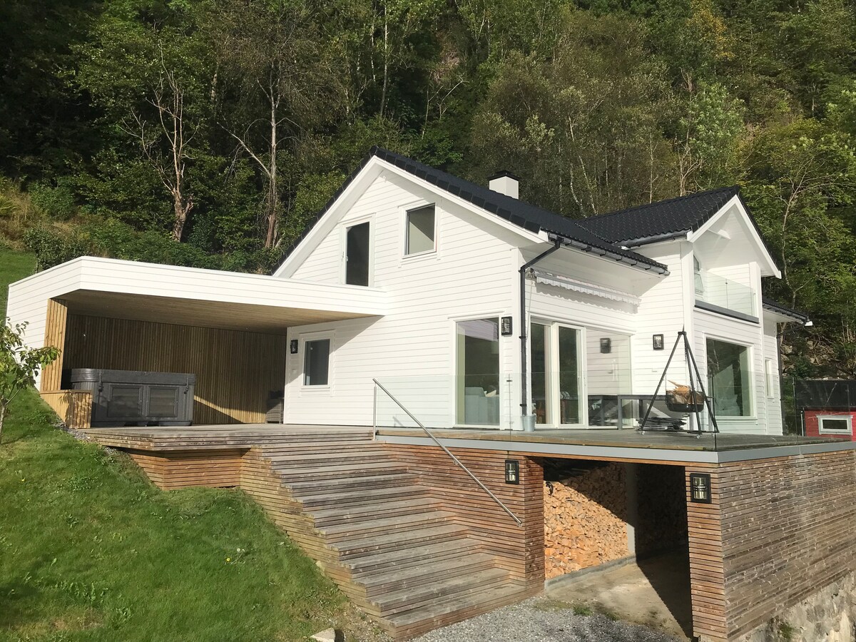 Beautiful and modern cabin by the fiord, with motorboat. Perfect place to experience the magestic Hardanger Fiords with facilities for fishing, hiking and skiing. Close to the glacier Folgefonna (with ski resort) Be a guest in a comfortably furnished holiday home with modern furniture, equipped with all your basic necessities. The cozy living room invites you to start your vacation here and make new plans for exciting excursions.