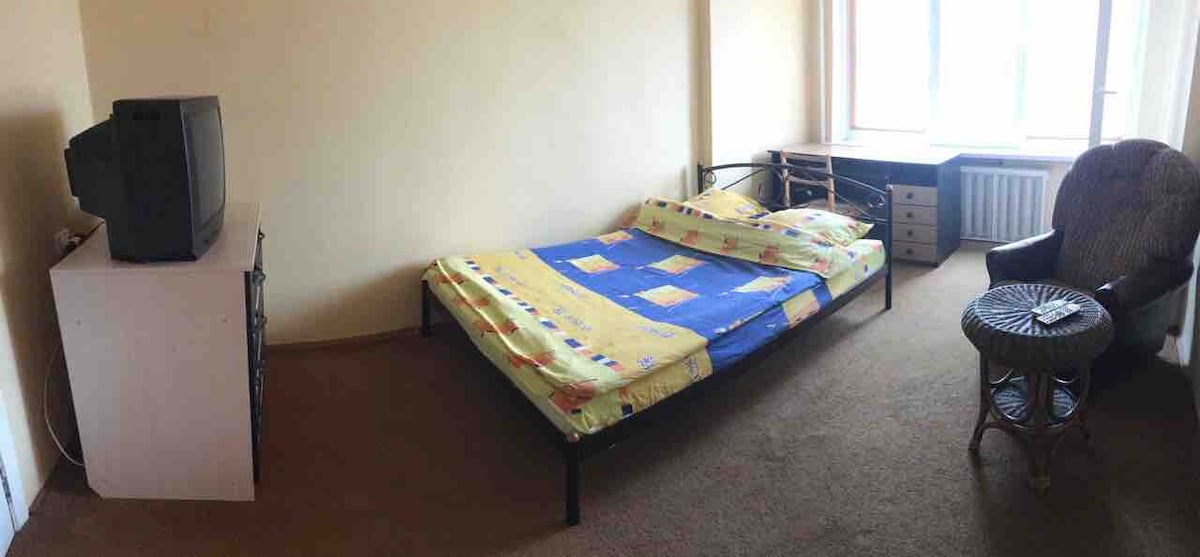 Sunny and warm apartment, completely new. At the disposal of guests everything you need. Kitchen dishes, towels, bedclothes, hair dryer, household appliances are all brand new. The apartment is located in the center of the Rusanovka district, an artificial island surrounded by water. A five-minute walk the river embankment with a many restaurants with varied cuisine - Italian, Greek, American, European, one fish and one breakfast restaurants. The exhibition center (IEC-expo) is a 15-minute walk.