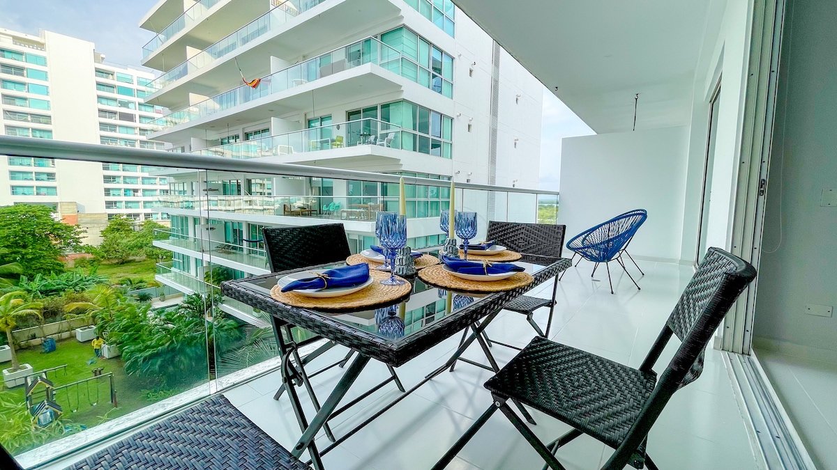 Luxury beachfront apartment in Morros Epic, La Boquilla - Cartagena's only Blue Flag certified beach. Panoramic Caribbean ocean views, private beach access and five-star resort amenities. Located 20 minutes from Cartagena's historic center and 8 minutes from Las Ramblas Shopping Mall. Perfect for families, couples, remote work and luxury vacations. Exclusive North Zone location, away from crowded Bocagrande, offering complete privacy and 24/7 security.