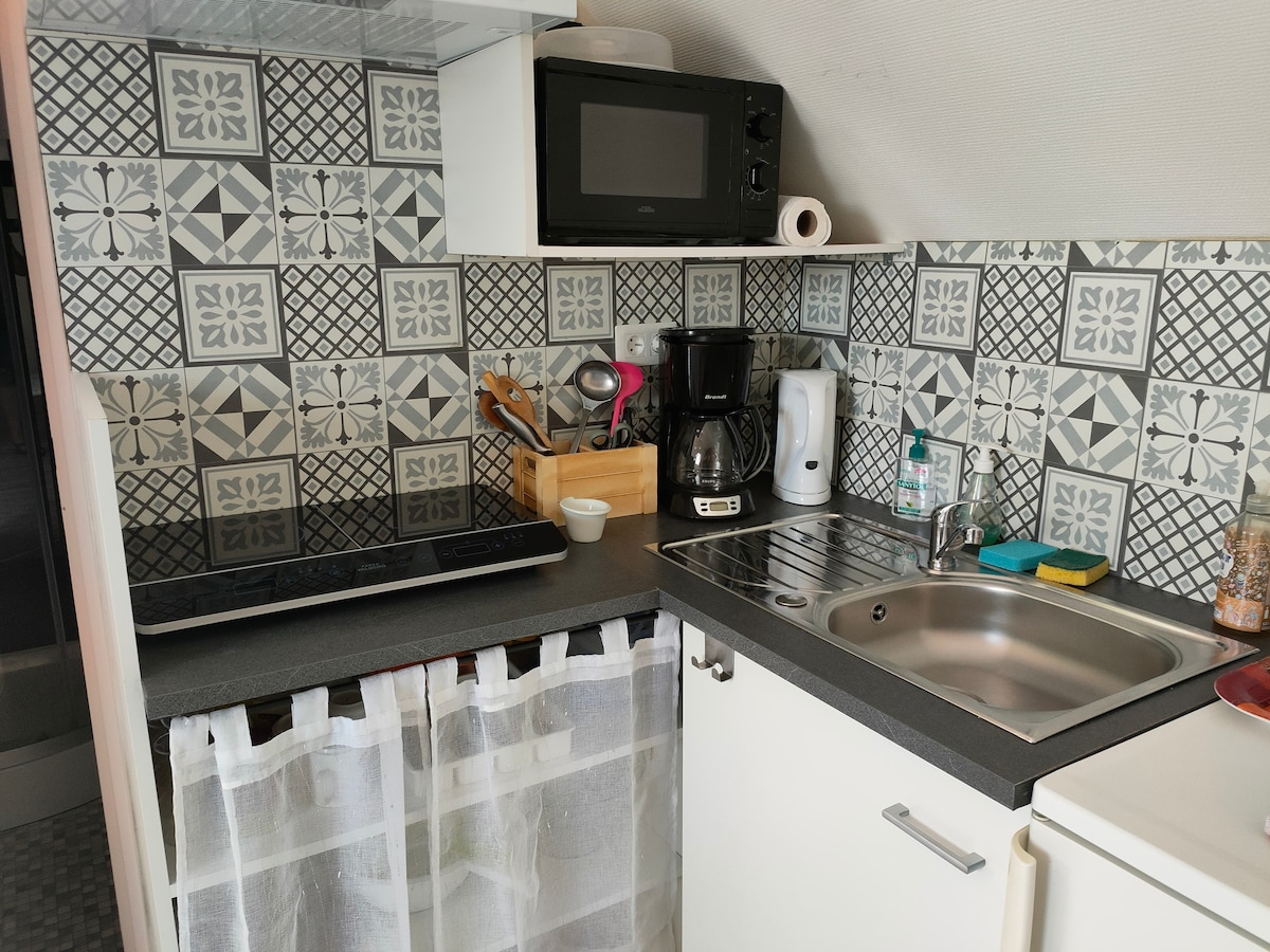 Logement meublé,au calme et lumineux. Réalisation neuve à l'étage de notre maison principale. Son accès par un escalier extérieur,vous garantie une indépendance totale. Vous y trouverez : Une grande pièce à vivre avec un canapé fixe,un téléviseur. Un coin cuisine équipé plaque induction, micro onde , hotte, évier et réfrigérateur.Cafetière+bouilloire. Une salle d'eau + wc, ainsi qu'une chambre avec lit 2 places. Drap,housse couette, oreillers traversin,serviettes de toilette fournis