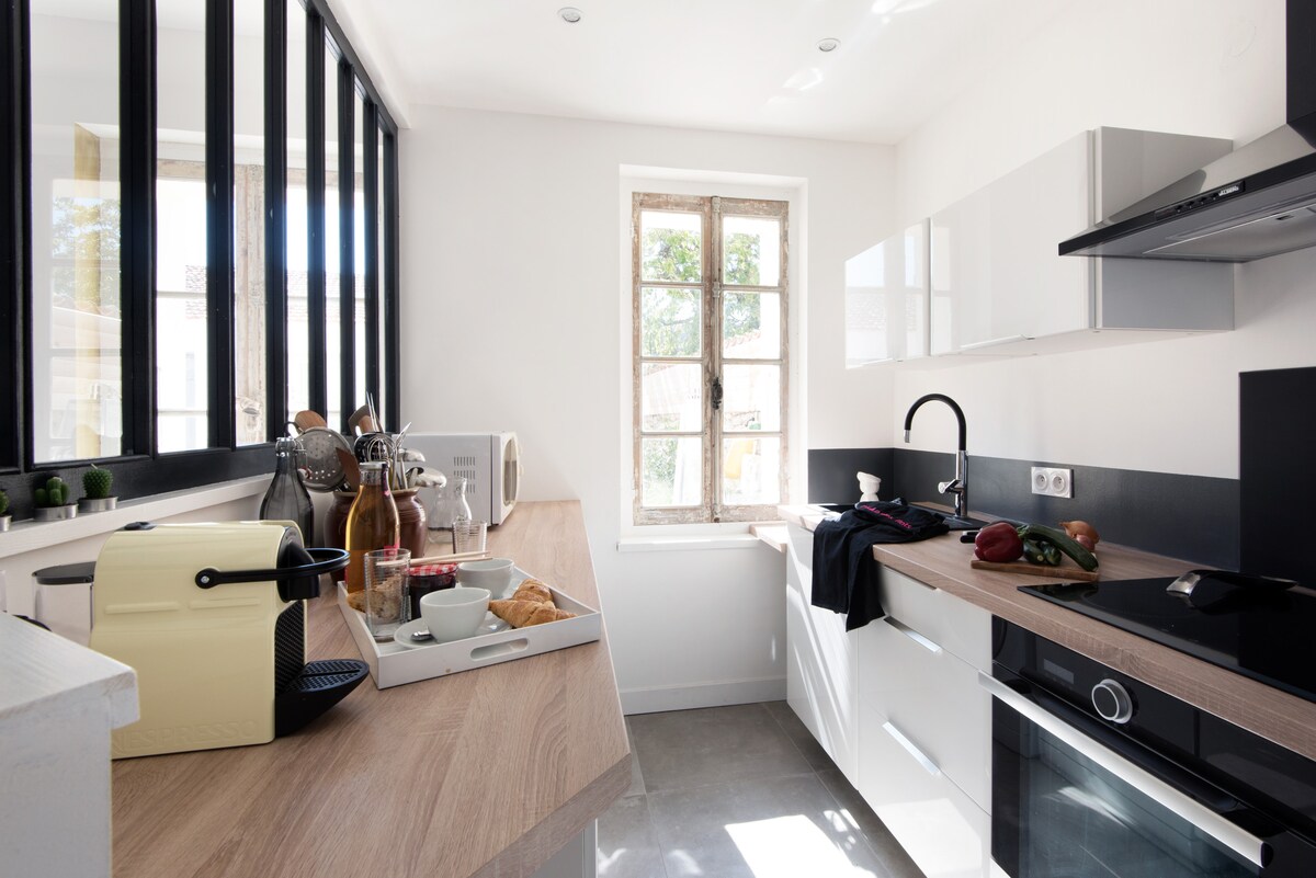 Wyjątkowy styl 🏡 dom z 2 wygodnymi sypialniami, pełną kuchnią i jasnym salonem z widokiem na basen. 🌿 Ciesz się zacienioną jadalnią idealną na wieczory, basenem z zadaszonym tarasem, na którym można się ochłodzić, oraz prywatnym parkingiem z punktem ładowania pojazdów elektrycznych. Idealne miejsce na pobyt z rodziną, przyjaciółmi lub w parze, pod znakiem relaksu.