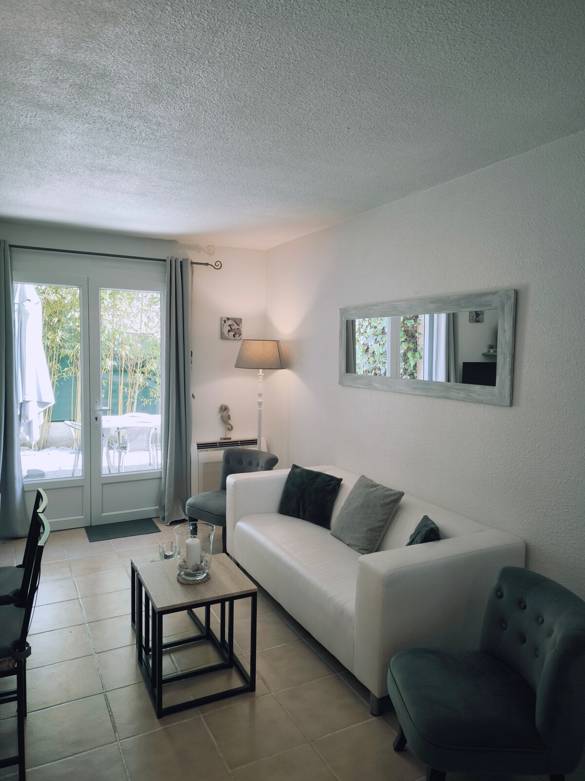 Superb apartment with garden terrace private parking, located in a small, quiet and secure residence 10 minutes walk from the village, facing the beach. The garden has an arbor, equipped with a large sofa, table and outdoor refrigerator. The apartment has been renovated in a contemporary style. It has a beautiful layout in the form of a large living room with open kitchen, a bedroom, bathroom, separate toilet, and a beautiful terrace with table, chairs, deckchairs...