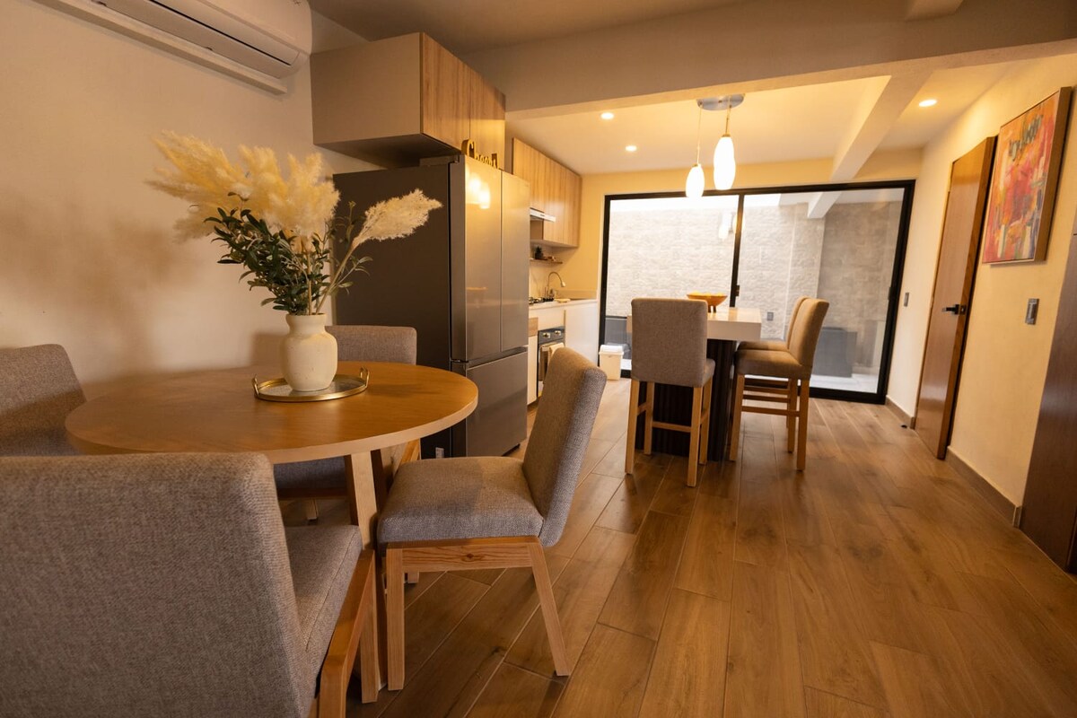 Relájate en este espacio tranquilo y elegante, ideal para pasar unos días de descanso. Con alberca privada climatizada ( 30 a 32 grados), relajante jardín, terraza abierta, cocineta y asador esta completamente equipada. Cuenta con 2 recamaras con un excelente diseño y preparadas para que disfrutes de un descanso placentero, con cama King en la principal y Queen en la segunda recamara ✔ Minisplit en ambas recamaras. ✔ Mini enfriador en recamara principal ✔ Internet en toda la casa de 500 Megas