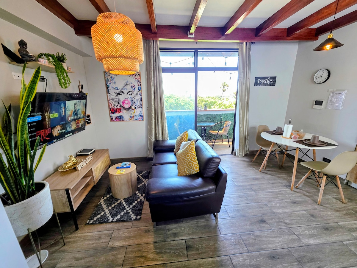Ciesz się, odpoczywaj i pracuj w tej cichej i eleganckiej przestrzeni. Będziesz mieć 2 duże ekrany Smart o przekątnej 50" i 43" Znajduje się w centralnej i bezpiecznej okolicy. Posiada piękny taras i widok na park. Centrum handlowe znajduje się w odległości zaledwie jednego kroku, bulwar, restauracje, siłownia, Starbucks i ambasada Stanów Zjednoczonych w odległości 5 minut. Wi-Fi, telewizory z Netflix, Star+, biurko, kuchnia i sprzęt AGD, bezpieczeństwo i komfort