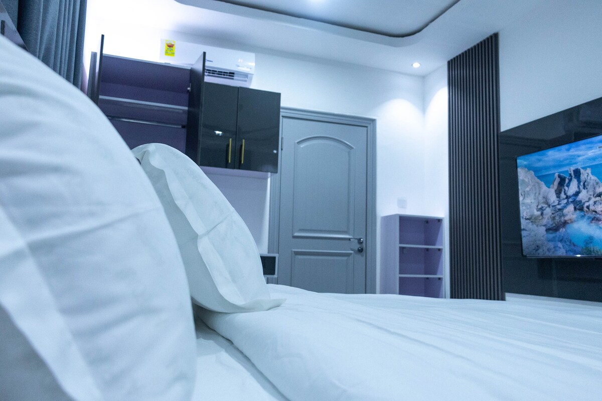 Luksusowy, nowo wybudowany, przestronny apartament z jedną sypialnią i łazienką na wynajem krótkoterminowy i długoterminowy. Dom znajduje się w doskonałej części North Legon. 9,5 km od międzynarodowego lotniska Kotoka i 1,5 km od University of Ghana, Atlantic Mall, Palace Mall, ogrodu botanicznego Legon, apartament jest blisko wszędzie. W pokoju z łazienką znajduje się duże łóżko, materac ortopedyczny i poduszki zapewniające spokojny sen. Inteligentny apartament wyposażony jest w kamery cctv, idealne miejsce na komfort i bezpieczeństwo.