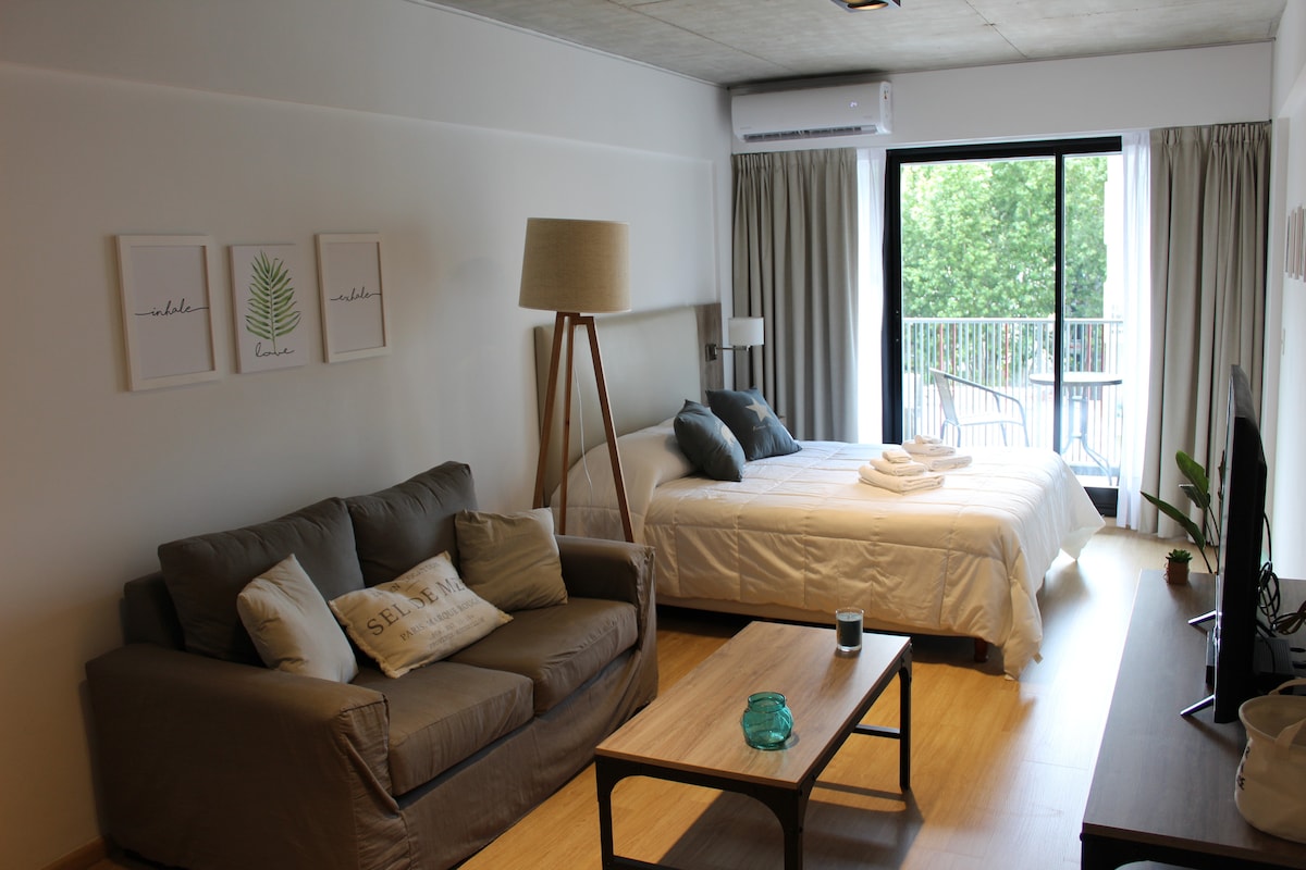 Nowoczesne studio w Palermo Hollywood. Powierzchnia apartamentu wynosi 30 metrów plus balkon. Posiada klimatyzację ciepło/zimno, łóżko typu Queen, telewizor Smart TV 43", jadalnię z barem i kuchnię z kuchenką, piekarnik, dzbanek i elektryczny ekspres do kawy. Apartament posiada własną przestrzeń magazynową w piwnicy dostępną do przechowywania walizek lub innych rzeczy.