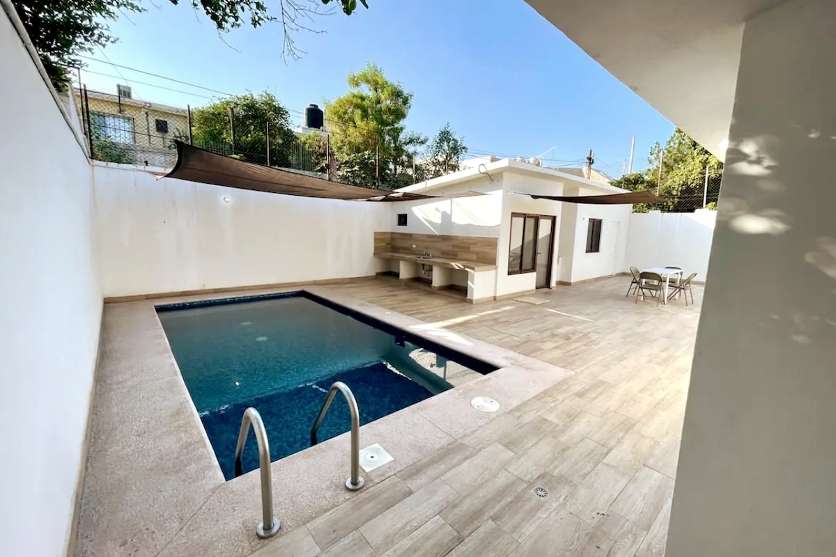 Dom 950 m od bulwaru (12 minut spacerem lub 2 samochodem), z niesamowitym patio, gdzie można korzystać z basenu, leżaków, grilla, paleniska gazowego i jadalni na świeżym powietrzu. Ten nowy dom może pomieścić 6 osób, w trzech sypialniach, każda z własną łazienką i telewizorem. Ponadto posiada salon z telewizorem, dużą kuchnię z jadalnią, parking na samochód, pralnię. Klimatyzacja i Wi-Fi we wszystkich pomieszczeniach.