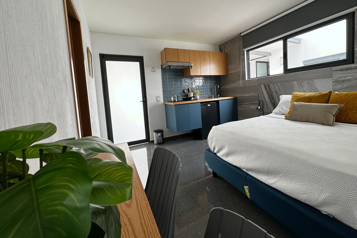 Ciesz się naszymi specjalnie zaprojektowanymi miejscami na pobyt podczas wizyty w Guadalajarze. Jest to nowo wyremontowana nieruchomość, posiada 8 studiów i przyjemny taras. Nasze studio 9 ma dużą łazienkę z toaletą, wygodne podwójne łóżko, telewizor Smart TV i wyposażony aneks kuchenny z luksusowymi wykończeniami. Czyste przestrzenie i wystrój, który zachęci Cię do relaksu i relaksu, a także cieszenia się jedną z najlepszych dzielnic w mieście.