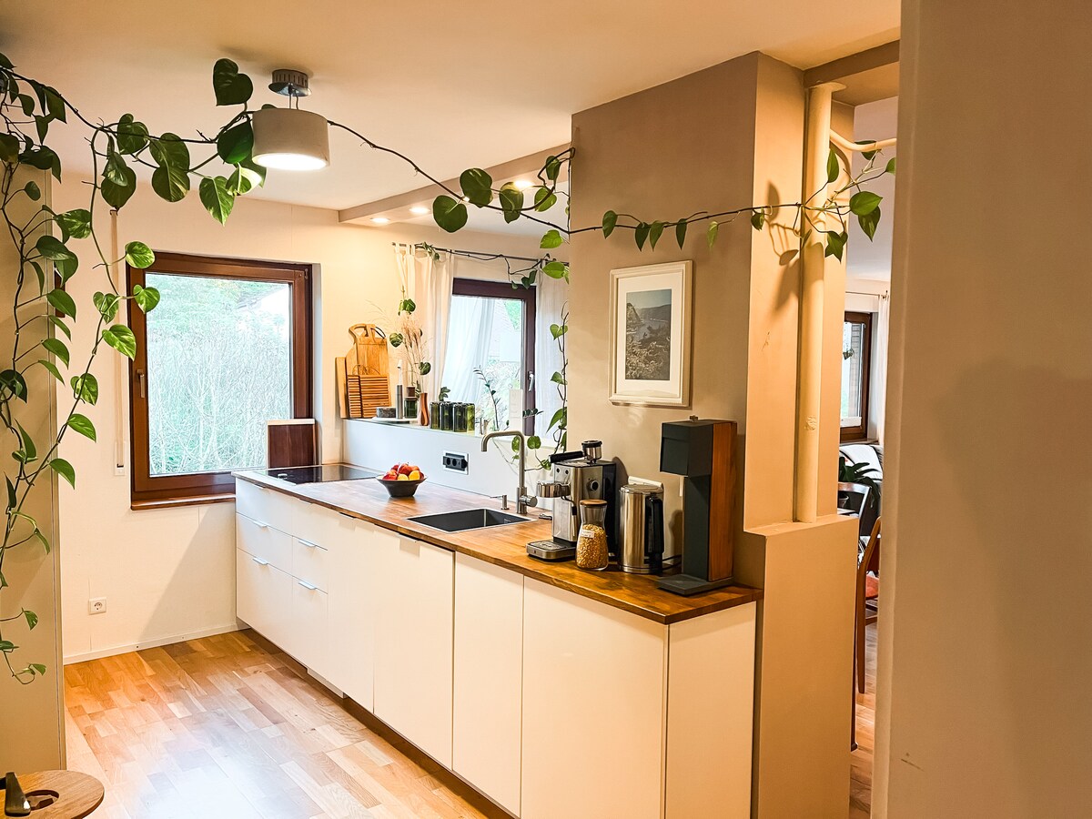 Dom jest otoczony zielenią, a jednocześnie blisko miasta. Wyjątkowa jest panorama nad doliną Renu i miasto do niemieckiego narożnika. Dom jest zalany światłem. W salonie znajduje się fortepian i biblioteka Steinway. Śniadanie w oranżerii lub na tarasie przed kuchnią. Jedna z sypialni jest bardzo duża i ma łazienkę. W trzech sypialniach materace leżą na podłodze.