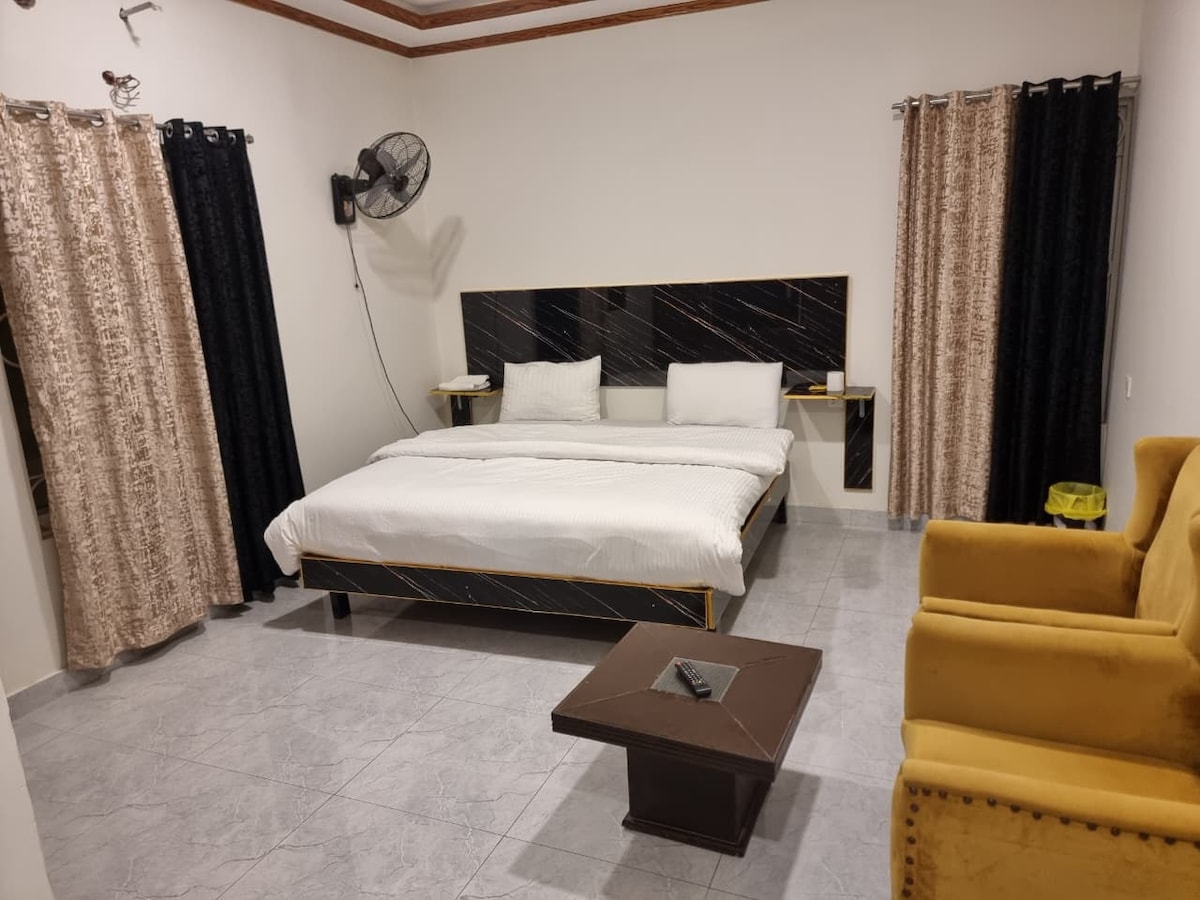 Premium Comfort in Lahore's Heart: Immerse yourself in luxury at our modern suite, perfect for couples or solo travelers. Enjoy a king-size bed, plush sofas. Key Features: Spacious & Modern: Relax in style with ample living area & contemporary furnishings. Unwind & Connect: 55" LED TV with 300 channels & free Wi-Fi keeps you entertained. Convenience In-room coffee/tea, AC, & full-time electricity with backup. Experience the best of Lahore from our centrally located suite. Book your stay today!