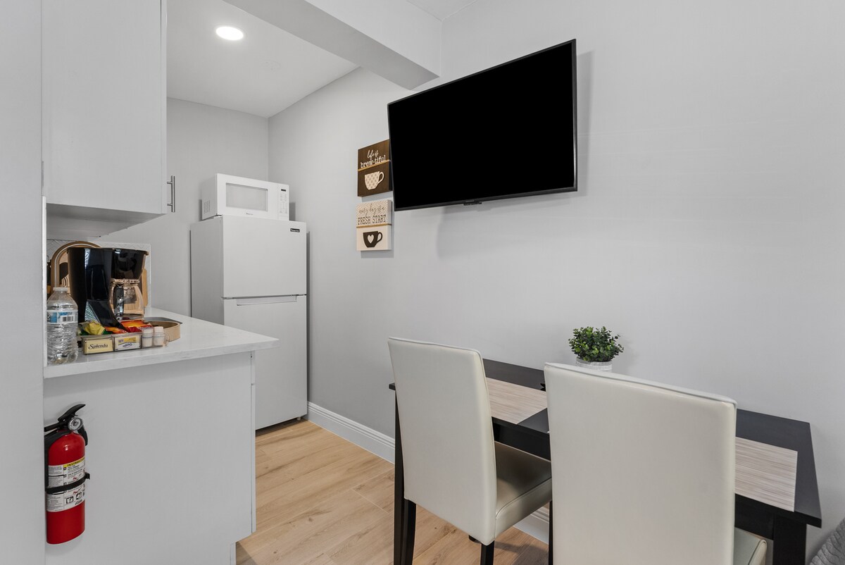 Witamy w odnowionej kawalerce w WPB na Florydzie. Ta przytulna przestrzeń, dołączona do domu jednorodzinnego, oferuje łóżko typu queen, szafę, wentylator sufitowy i 43-calowy telewizor Smart TV. W łazience znajduje się kabina prysznicowa i toaleta. W aneksie kuchennym znajduje się lodówka, ekspres do kawy, toster, urządzenie do gotowania ryżu, frytkownica beztłuszczowa oraz kuchenka indukcyjna. Posiłki można spożywać przy stole dla dwóch osób. Zrelaksuj się na prywatnym patio z krzesłami. W pobliżu restauracji, sklepów, parków i plaży, z łatwym dostępem do transportu publicznego. Zarezerwuj teraz!